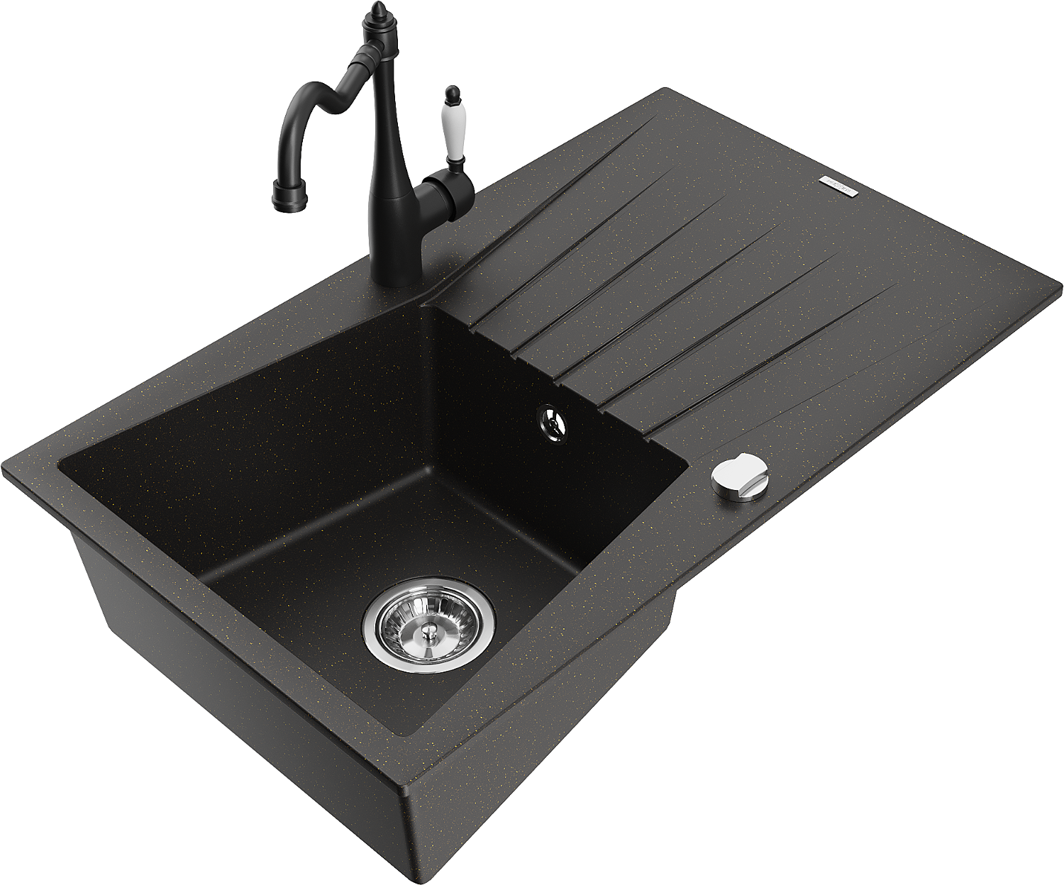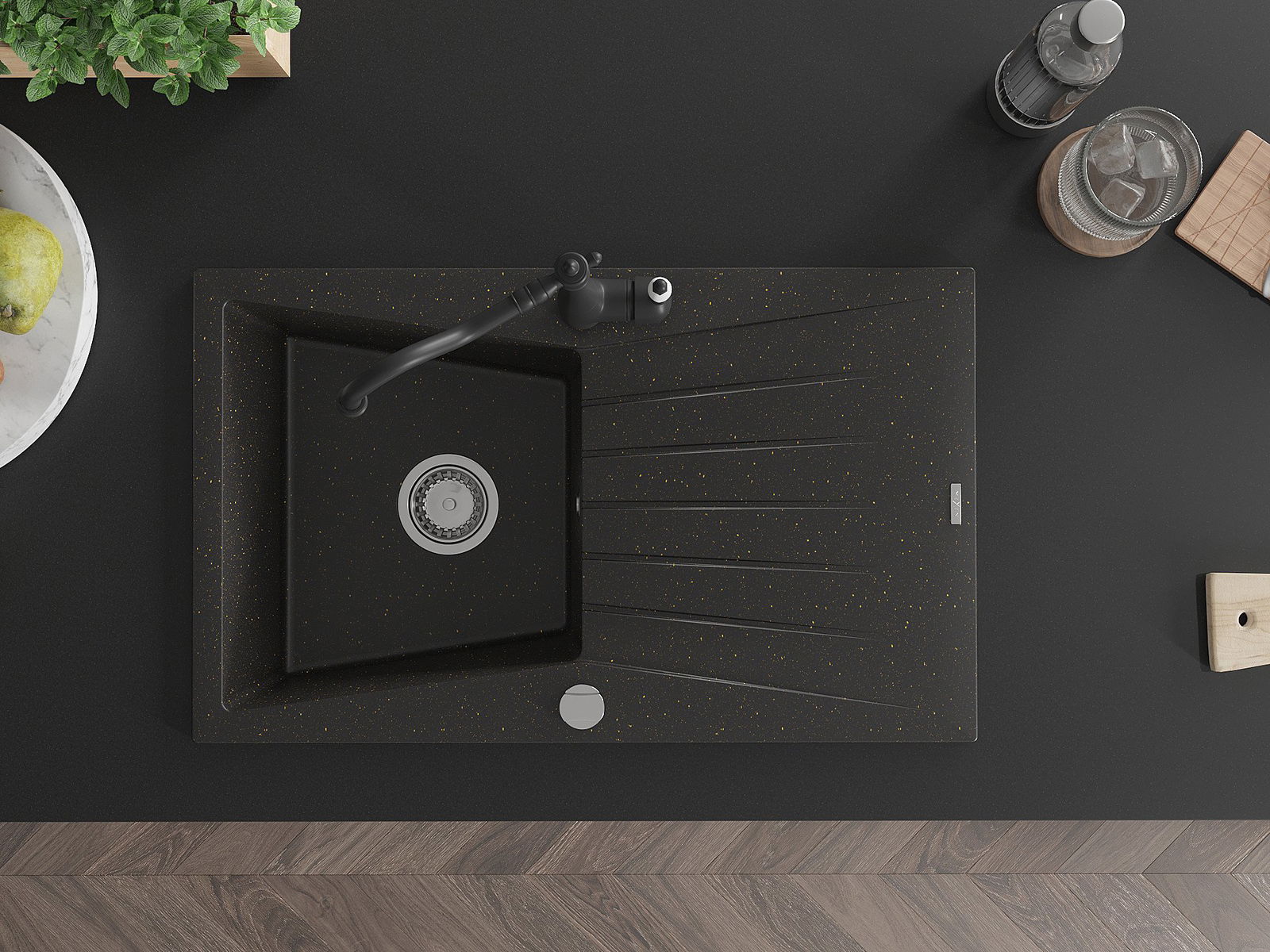 Mexen Cesar granitizlietne 1-kameras ar notekpannu un virtuves jaucējkrānu Carla, melns/zeltains metālisks - 6514-75-670700-70