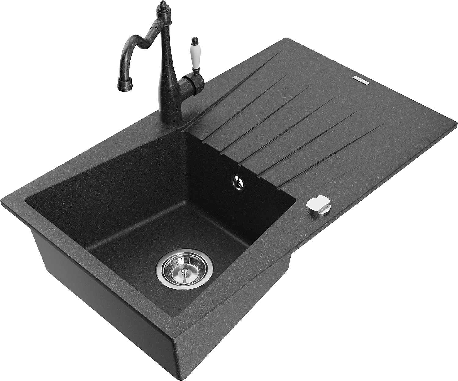 Mexen Cesar granitizlietne ar vienu nodalījumu ar drenāžu un virtuves jaucējkrānu Carla, melns ar punktiņiem