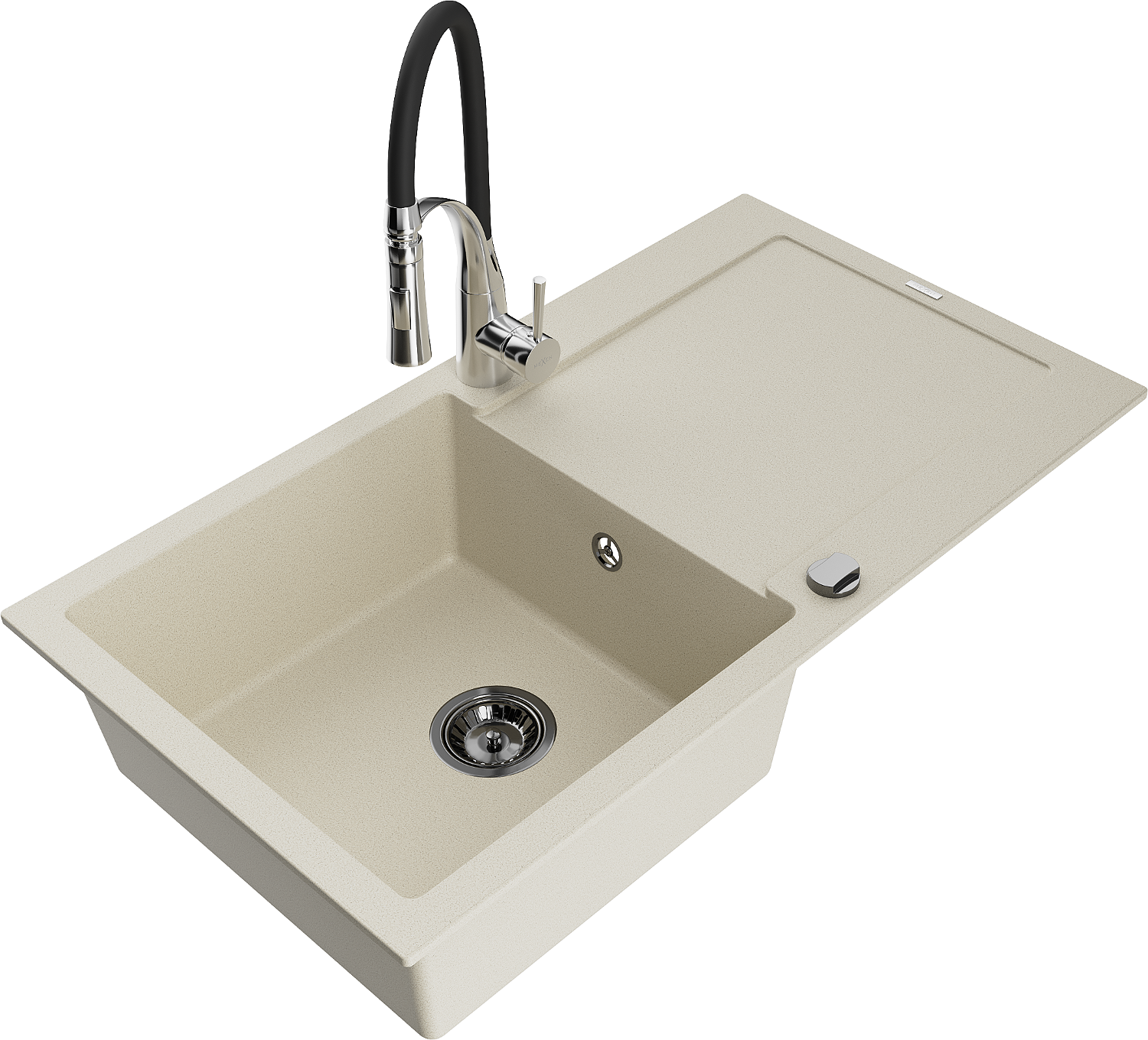Mexen Leo granīta izlietne ar vienu nodalījumu, pilienu tvertni un virtuves jaucējkrānu Aster, bēša - 6501-69-73450-07-B