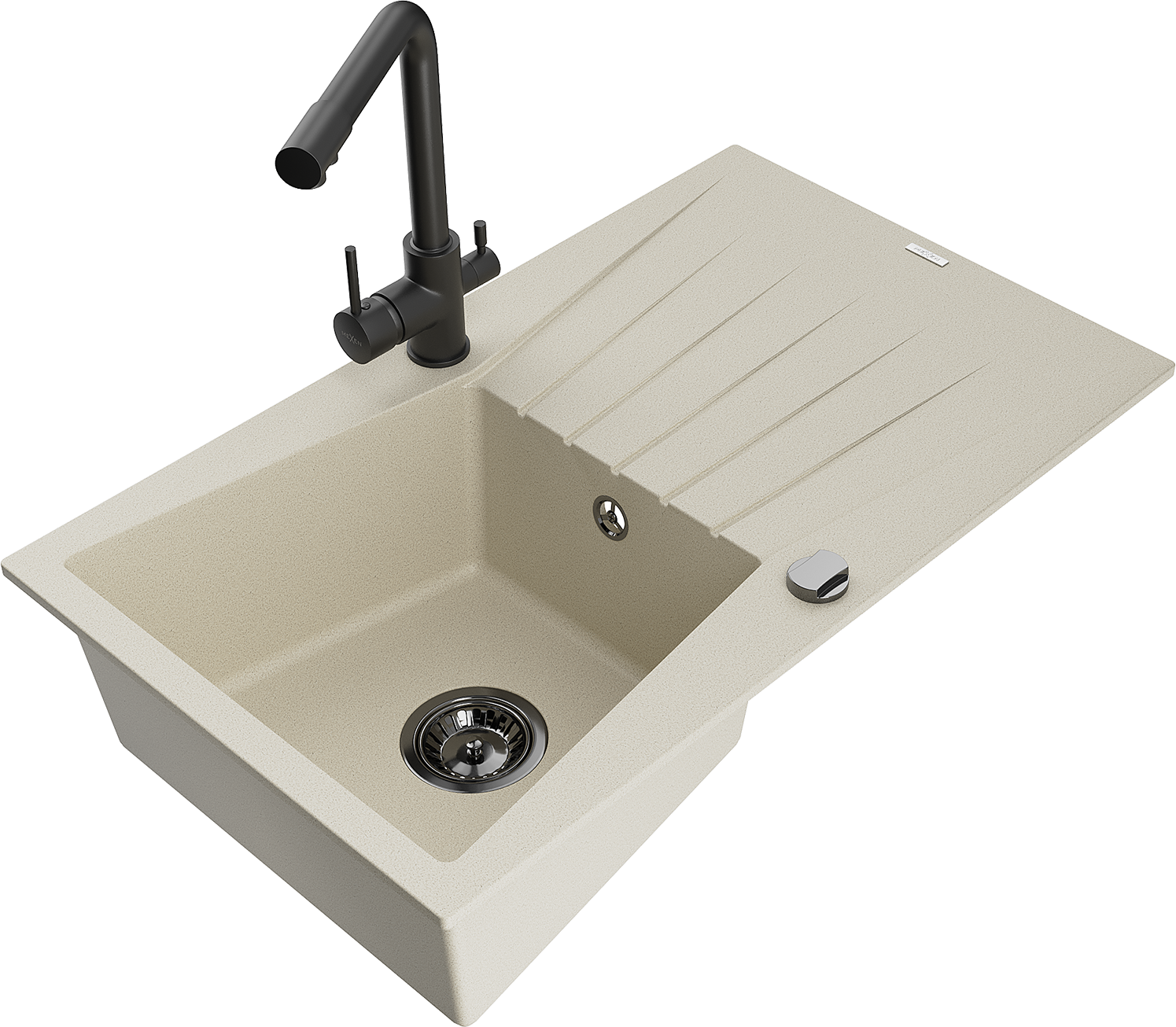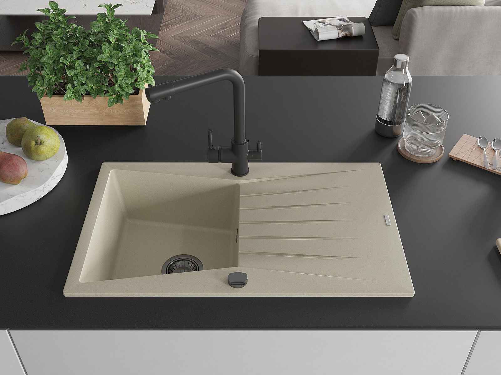 Mexen Cesar granīta izlietne ar 1 nodalījumu un notekas vietu un virtuves jaucējkrānu Duero, bēša - 6514-69-671600-70