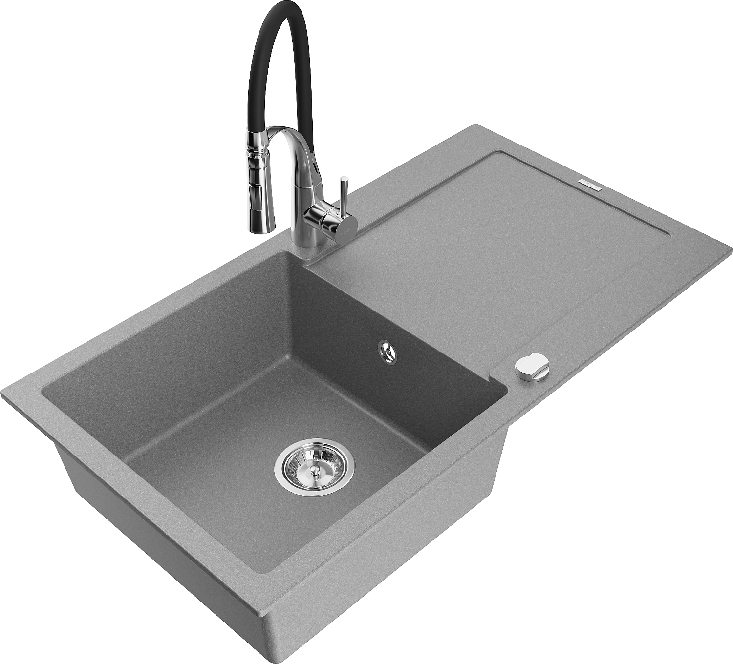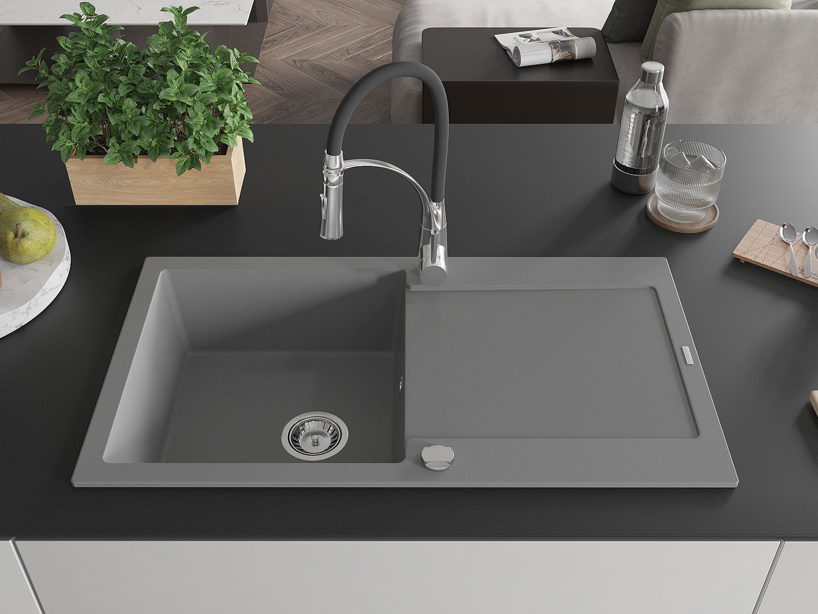 Mexen Leo Granīta izlietne ar vienu nodalījumu, noteci un virtuves jaucējkrānu Aster, pelēka - 6501-71-73450-07