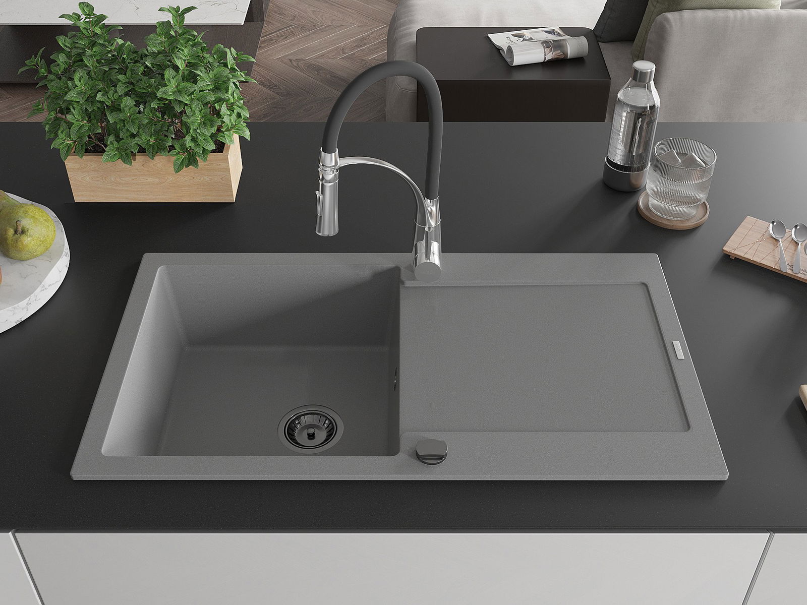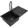 Mexen Leo granīta izlietne ar vienu nodalījumu, ar nožāvēšanas zonu un virtuves jaucējkrānu Aster, pelēks - 6501-71-73450-07-B