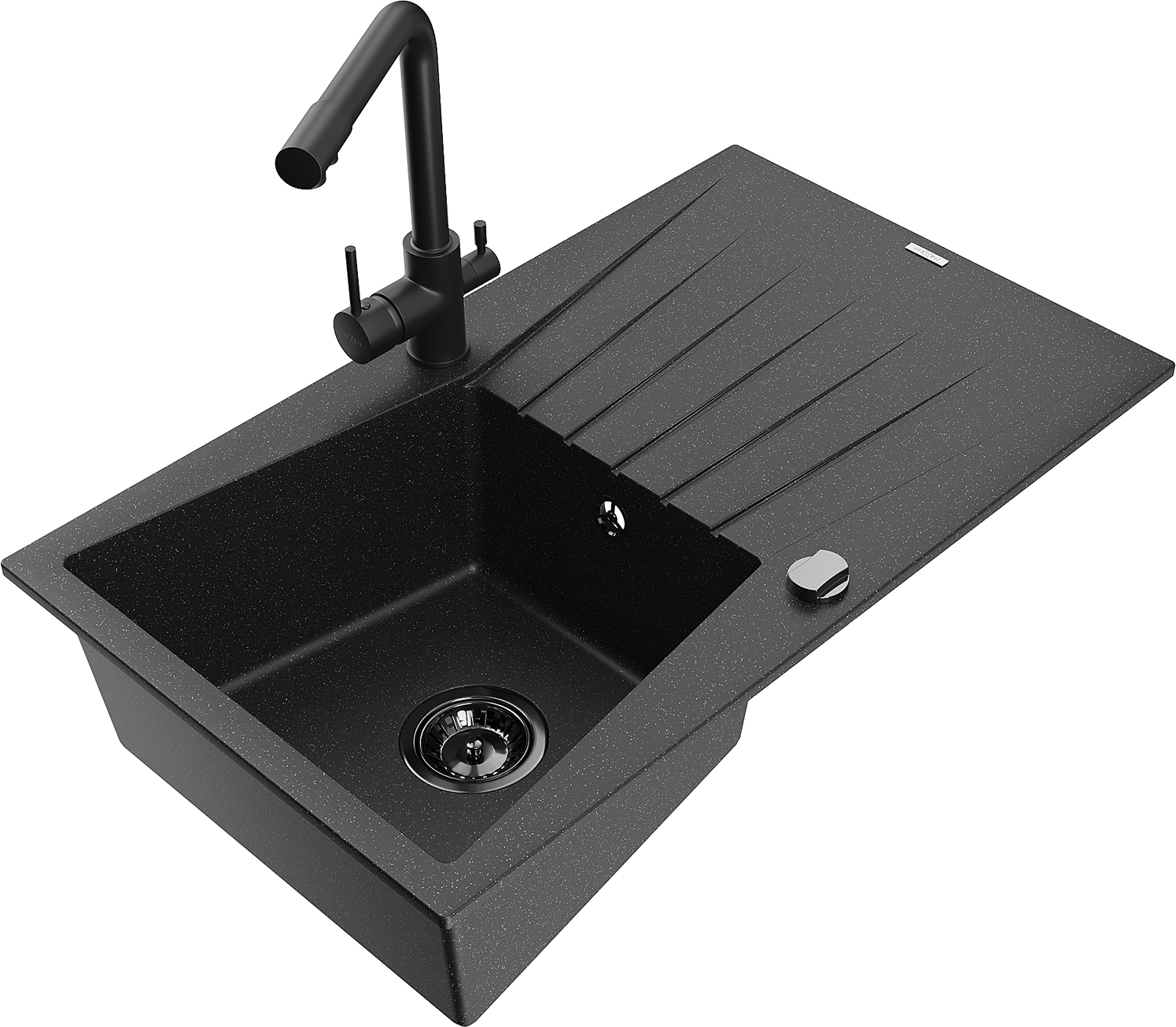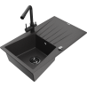 Mexen Cesar granitā izlietne ar 1 nodalījumu, noteku un virtuves jaucējkrānu Duero, melna/sudraba metāliks
