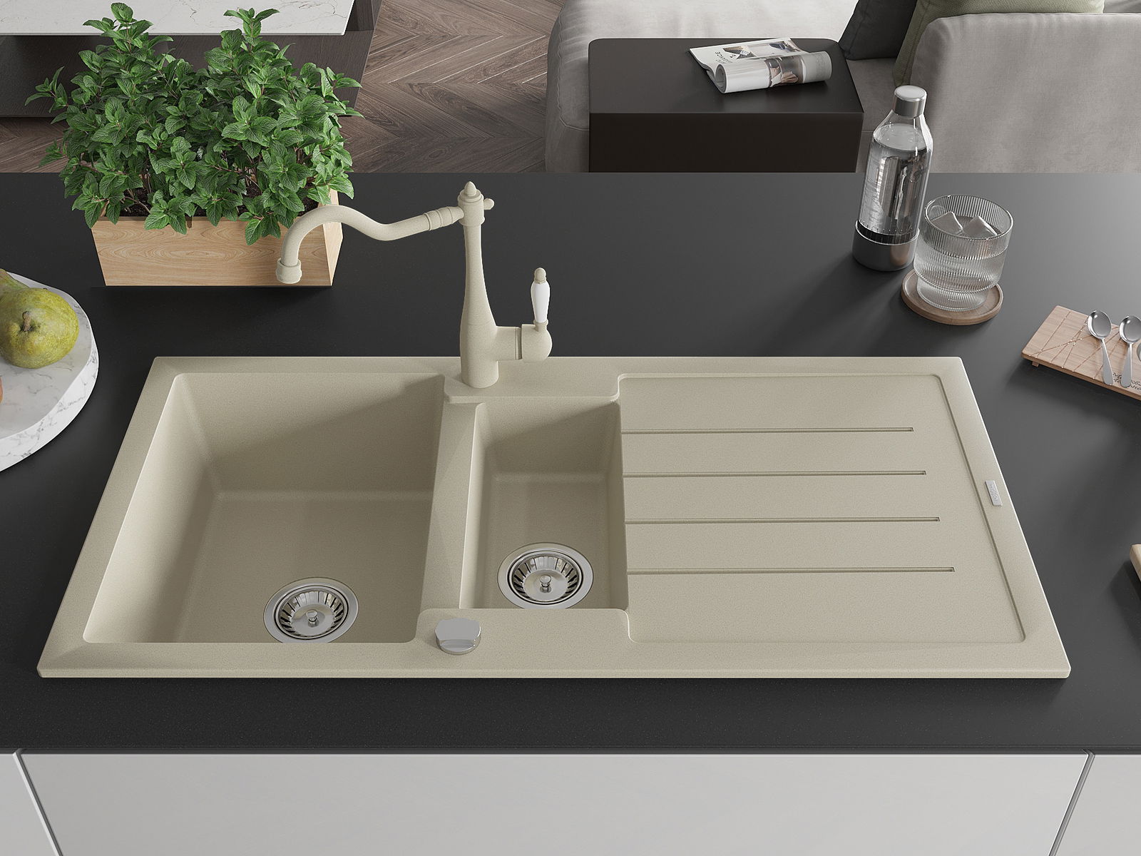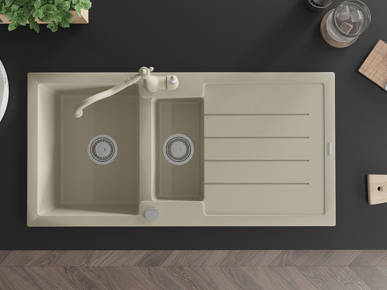 Mexen Andres granit izlietne ar 1,5 nodalījumiem, notecinātāju un virtuves jaucējkrānu Carla, bēšs - 6515-69-670700-69