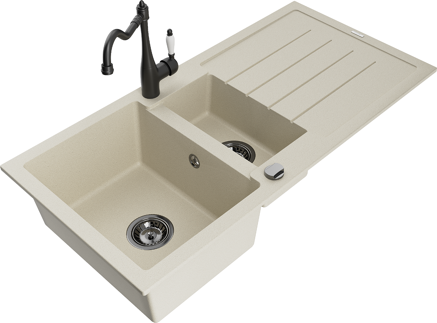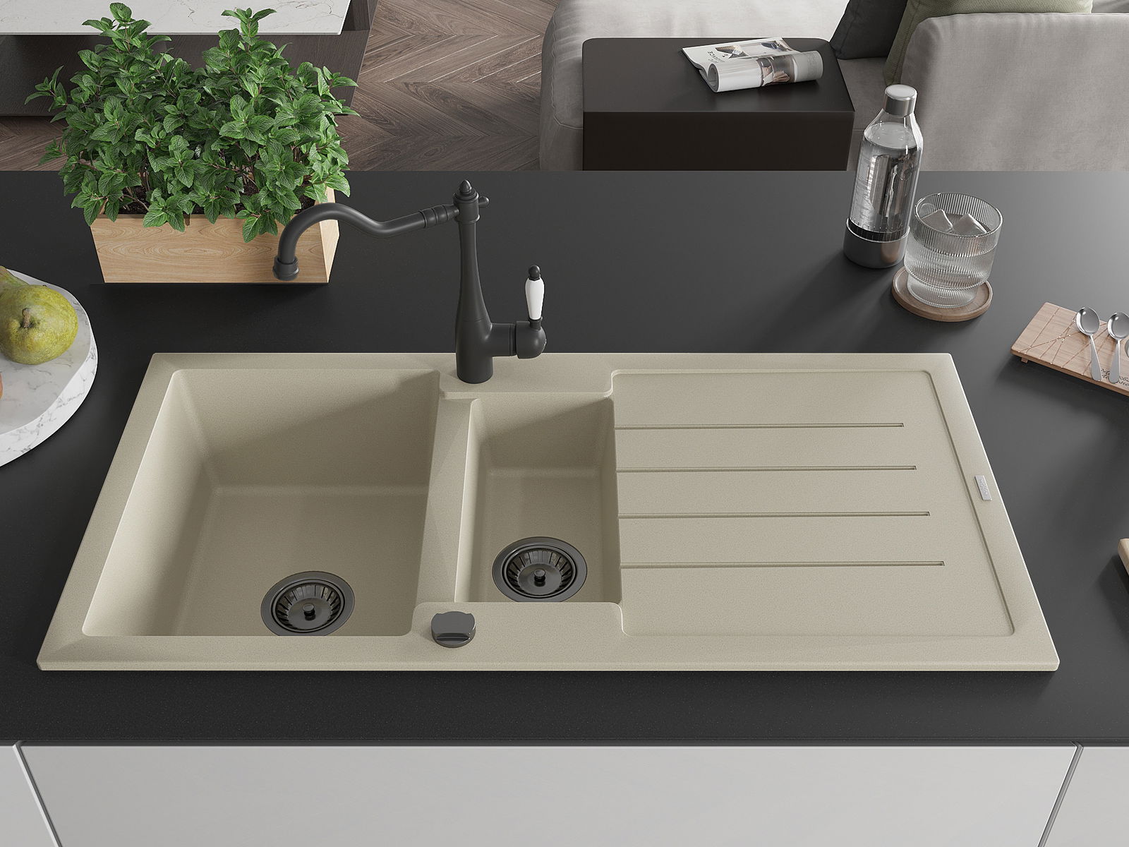 Mexen Andres granitais izlietne ar 1,5 nodalījumu un notecētavu, ar virtuves jaucējkrānu Carla, bēša - 6515-69-670700-70