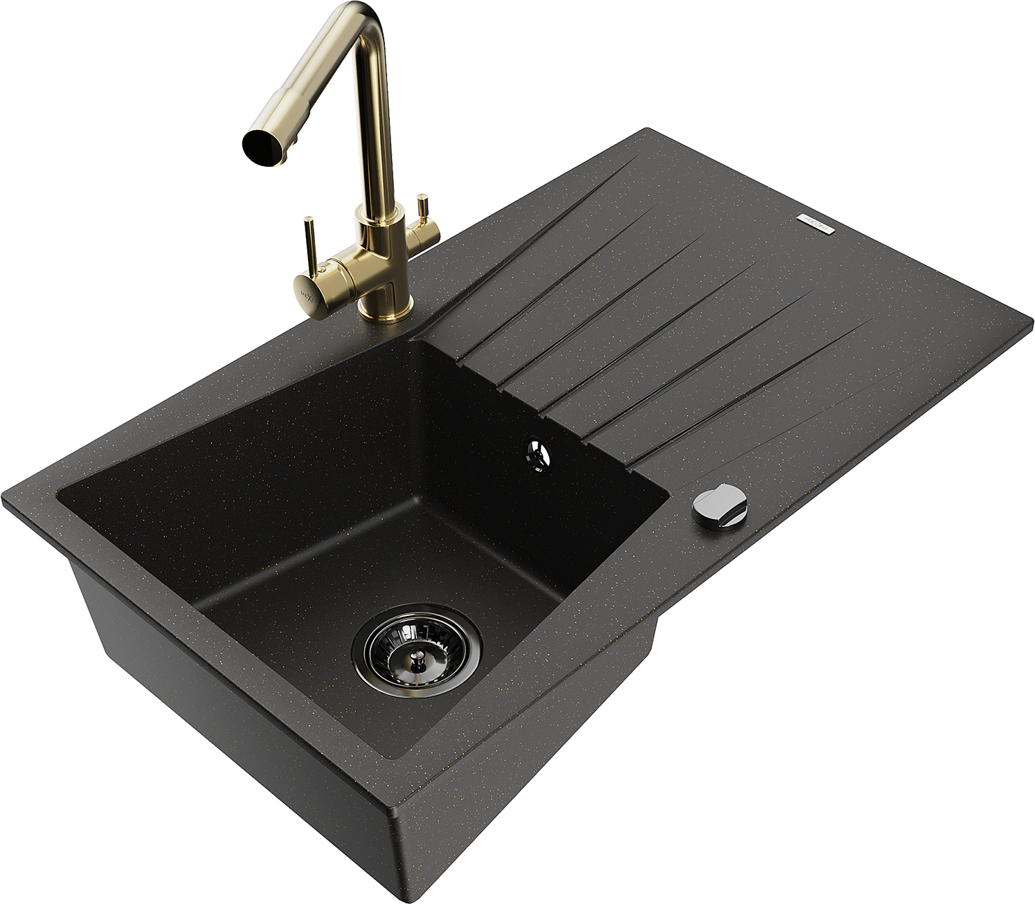 Mexen Cesar granitizlietne ar vienu nodalījumu ar notekas vietu un virtuves jaucējkrānu Duero, melns/zeltīts metālisks