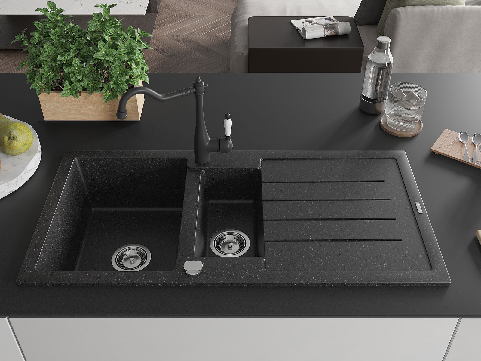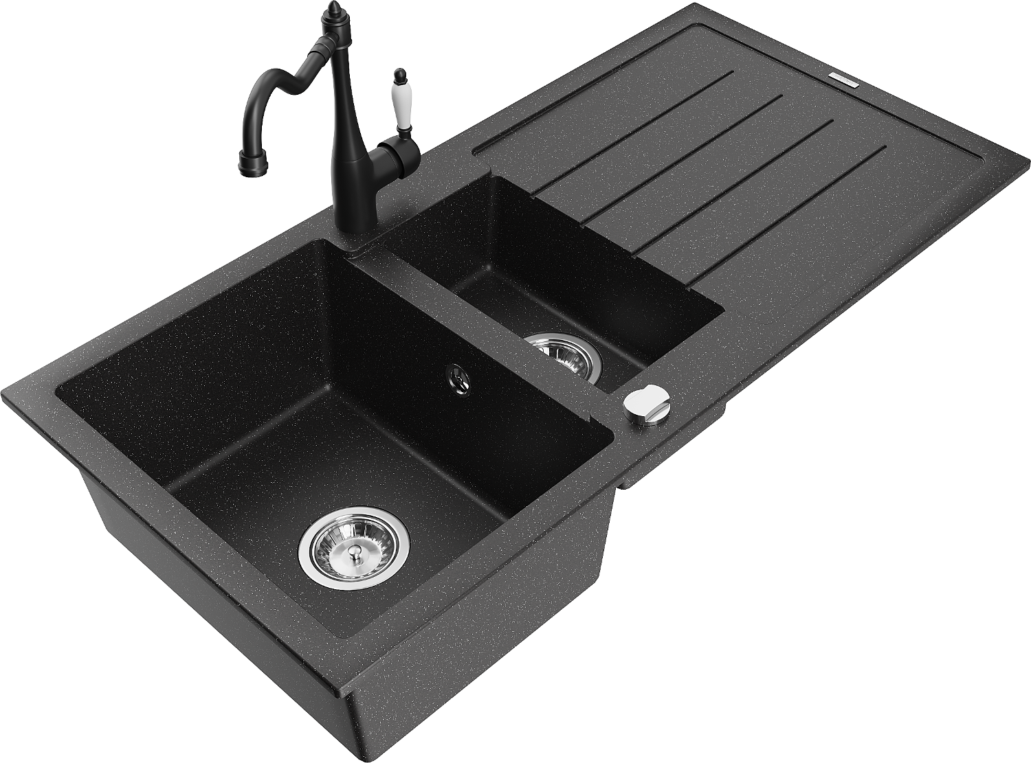 Mexen Andres granīta izlietne 1,5 nodalījumu ar notekpaplāti un virtuves jaucējkrānu Carla, melna/sudraba - 6515-73-670700-70