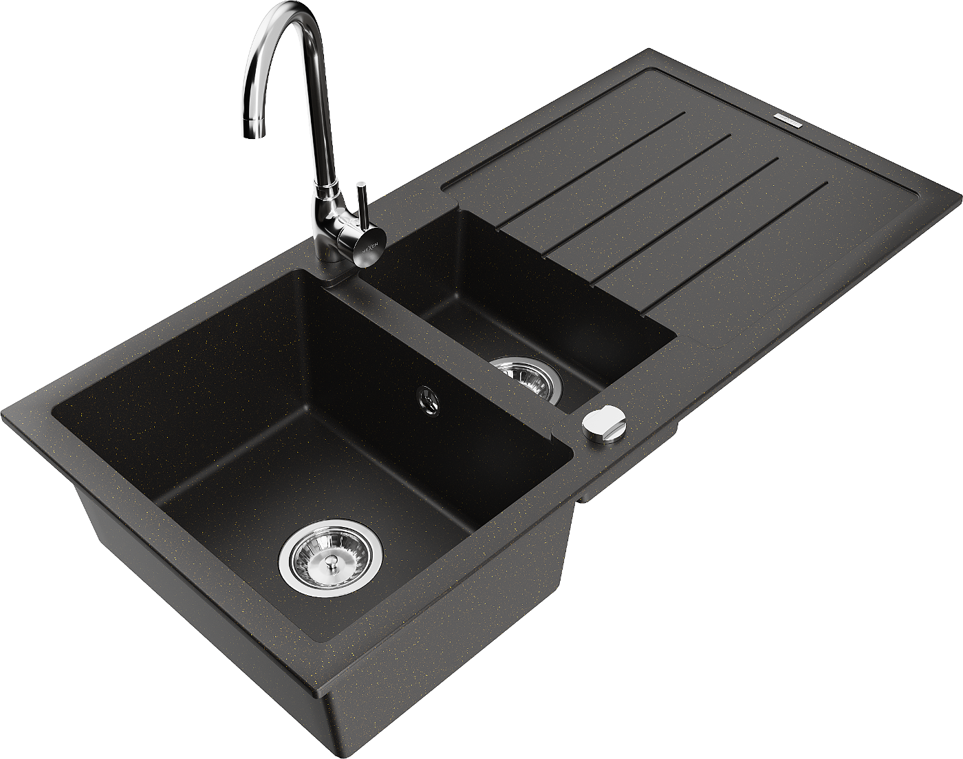 Mexen Andres Grants izlietne ar 1,5 nodalījumiem un noteces virsmu un Telma virtuves jaucējkrānu, melna/zeltīta