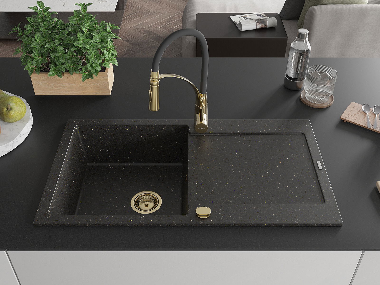 Mexen Leo granitizlietne 1-kamerrabža ar noteces zonu un virtuves jaucējkrānu Aster, melns/zeltīta metālika - 6501-75-73450-57-G