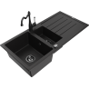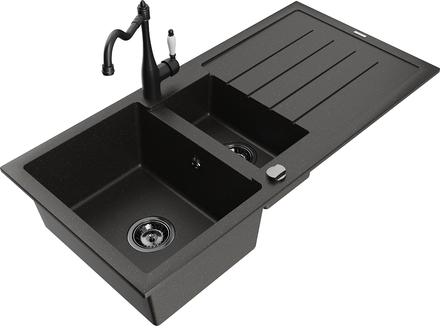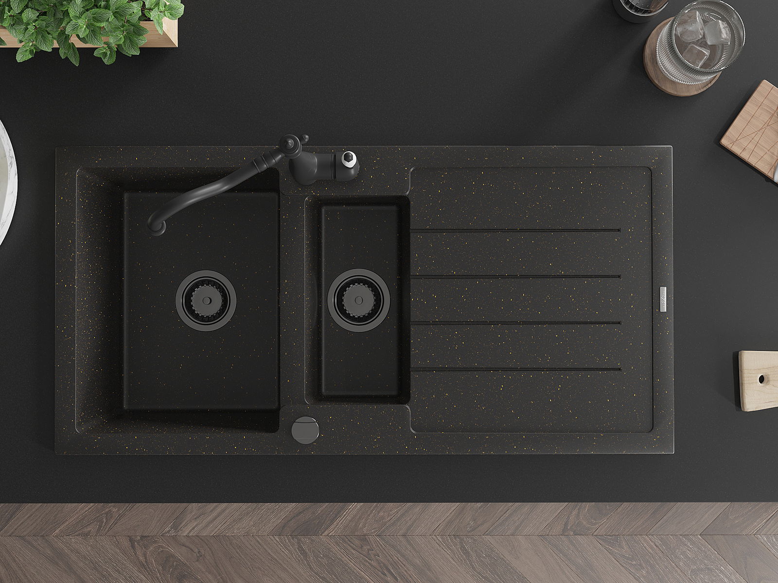 Mexen Andres grānīta izlietne ar 1,5 nodalījumu, iztekas un virtuves jaucējkrāns Carla, melns/zeltains - 6515-75-670700-70-B