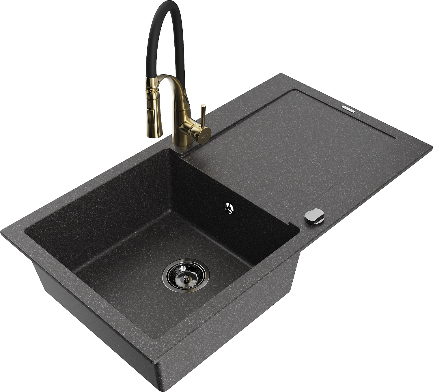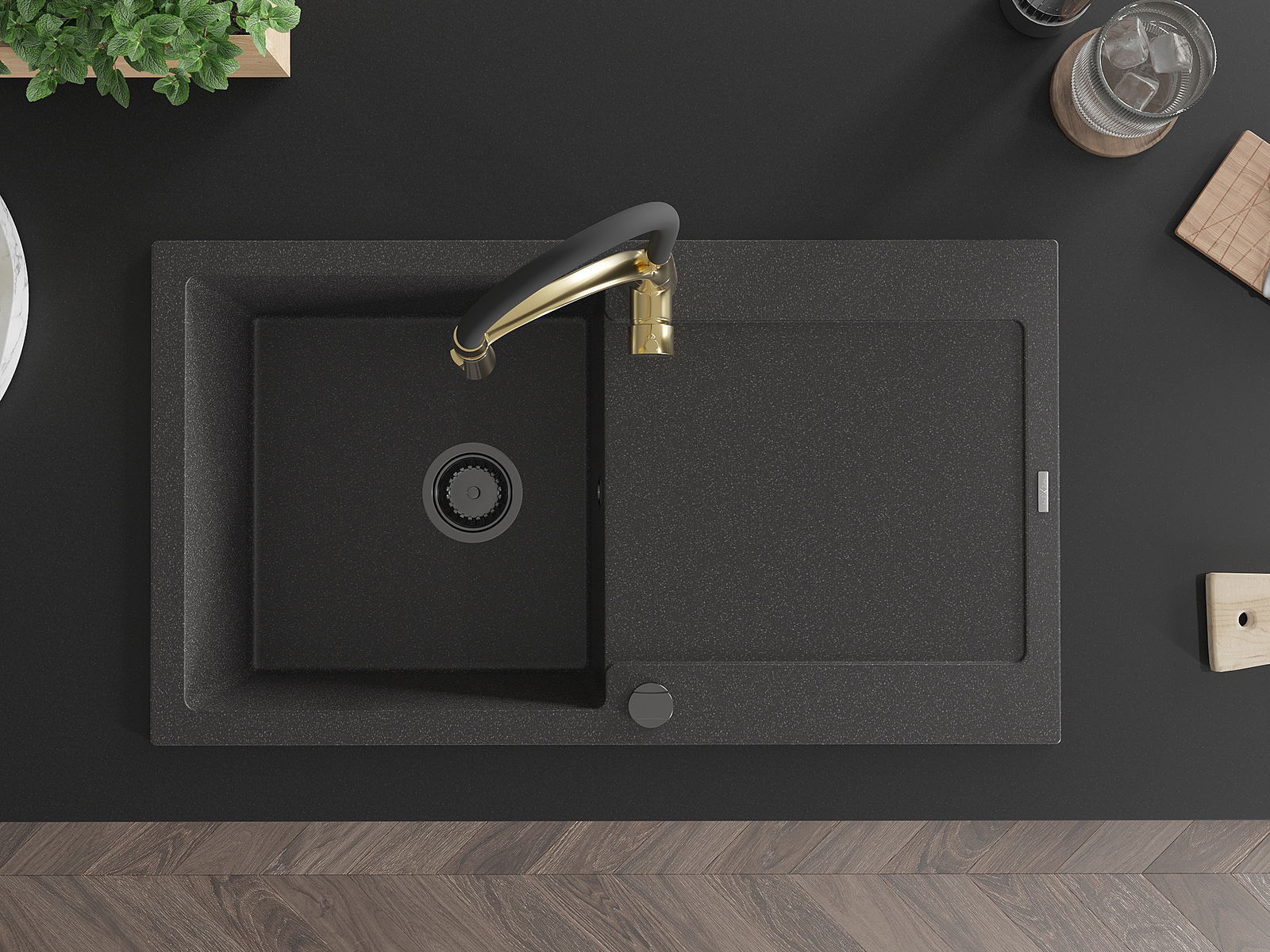 Mexen Leo grānīta izlietne ar vienu nodalījumu ar noteces zonu un virtuves krānu Aster, melna ar punktiem