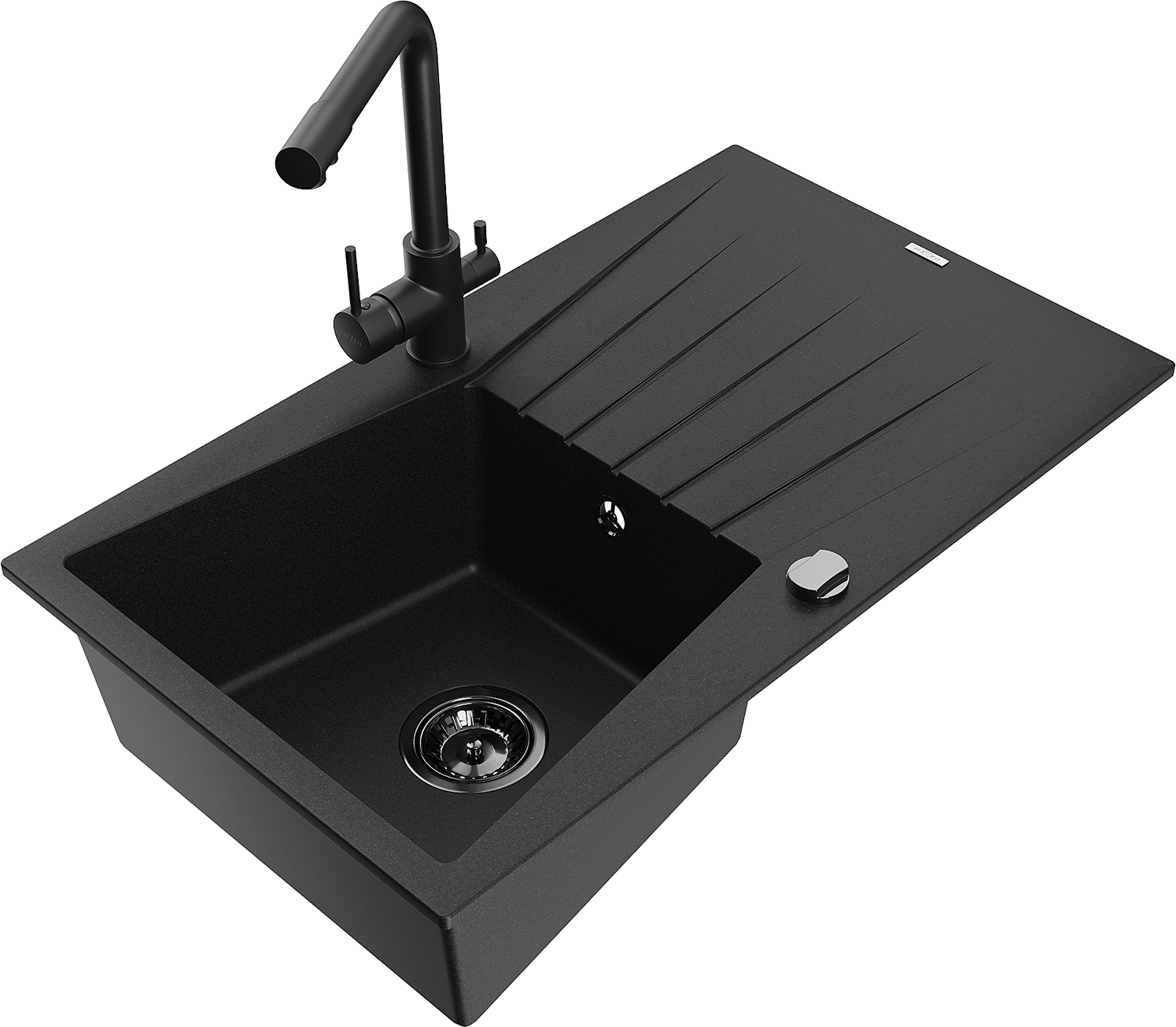 Mexen Cesar granīta izlietne ar vienu kameru, komplektā ar virtuves krānu Duero, melna - 6514-77-671600-70-B