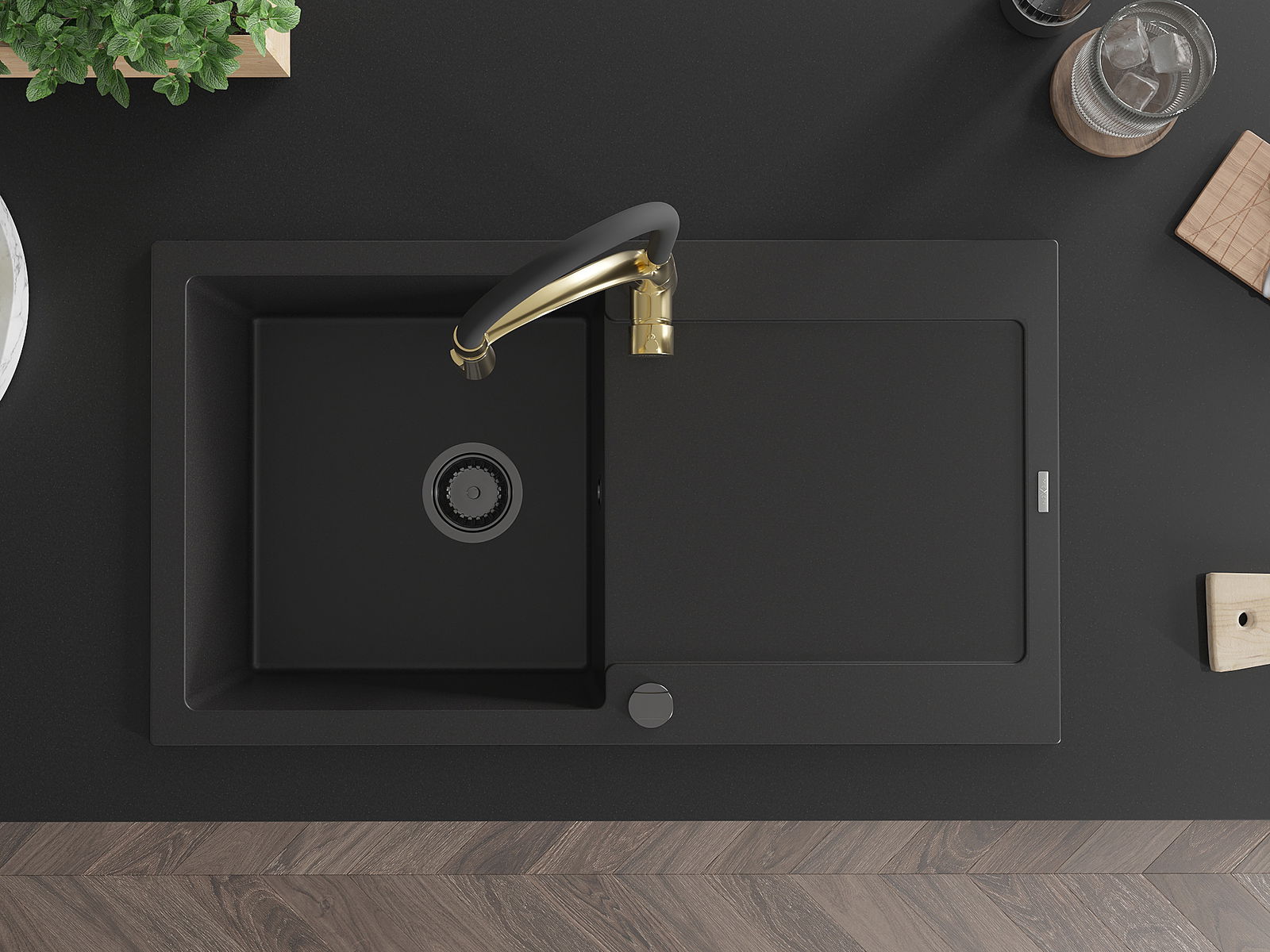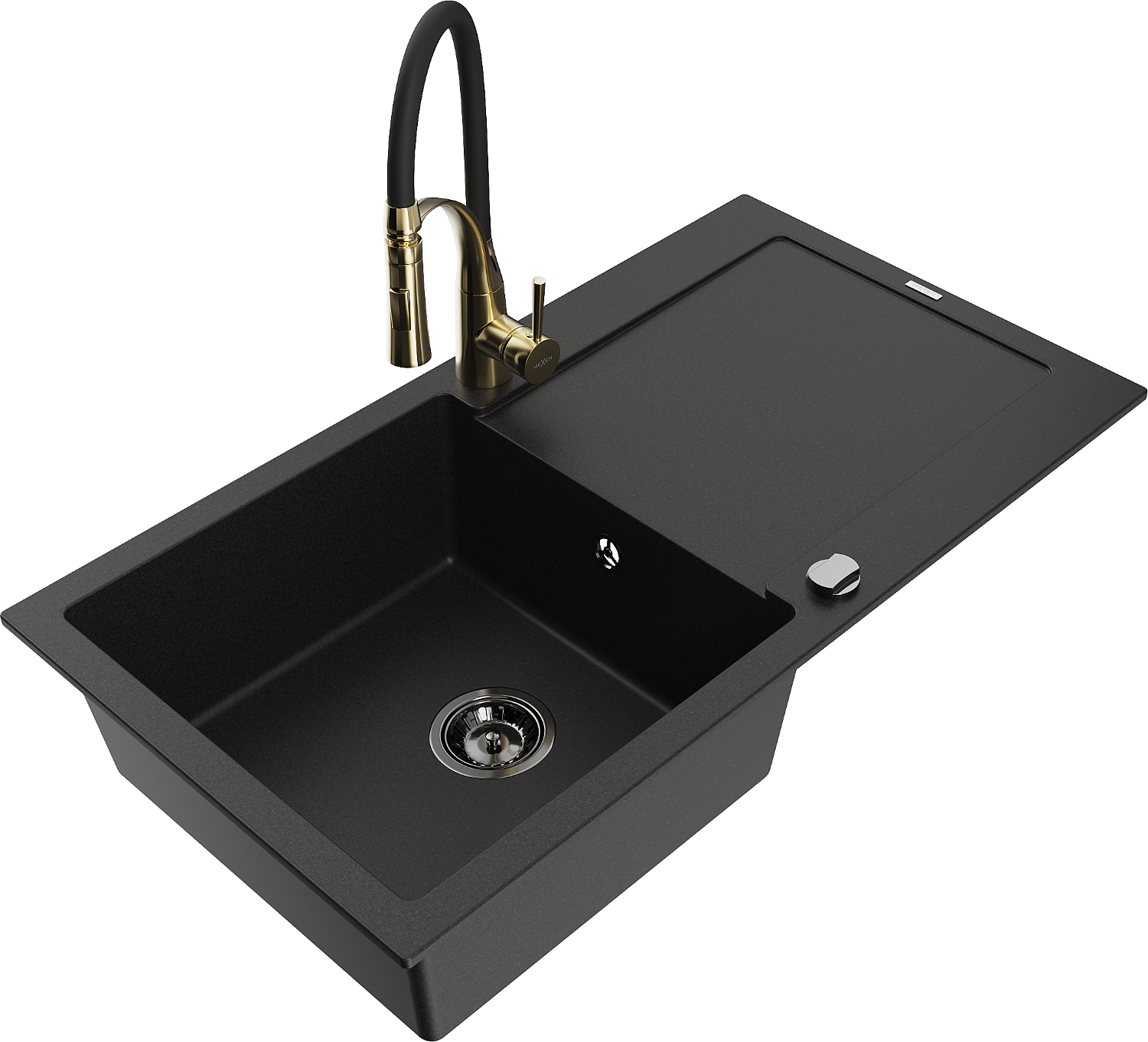 Mexen Leo granitizlietnis 1-nodalījuma ar notecinātāju un virtuves jaucējkrānu Aster, melns - 6501-77-73450-57-B