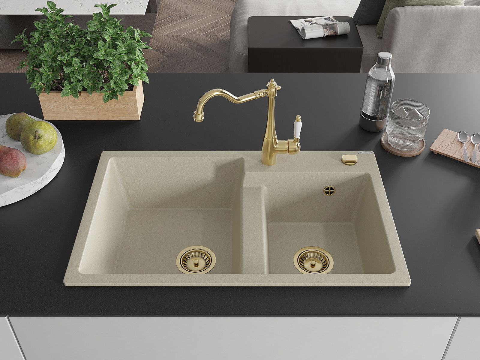 Mexen Tomas granitizlietne divnodalīta ar virtuves jaucējkrānu Carla, bēša - 6516-69-670700-50