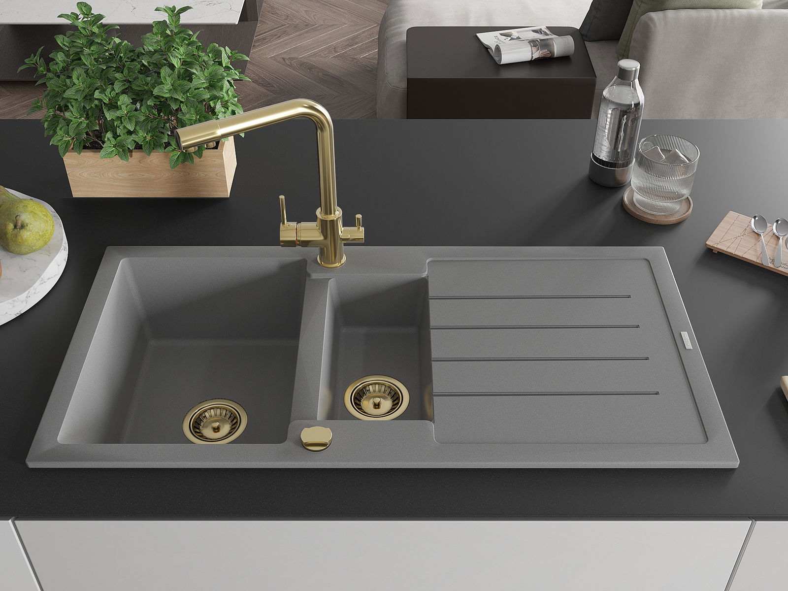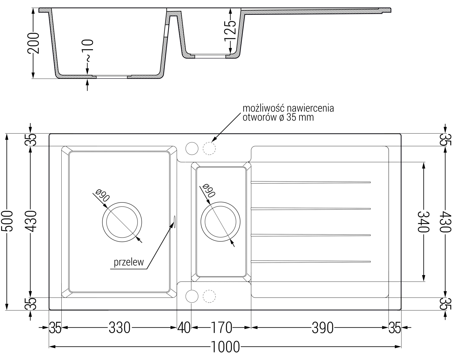 Izlietnei ir 2 daļēji izurbtas atveres ar diametru 35 mm, kuras var pašrocīgi izsist. Tās var izmantot, piemēram, šķidruma dozatora uzstādīšanai, kas novērsīs plastmasas pudeļu klātbūtni virtuvē un piešķirs tai elegantu apdari.
