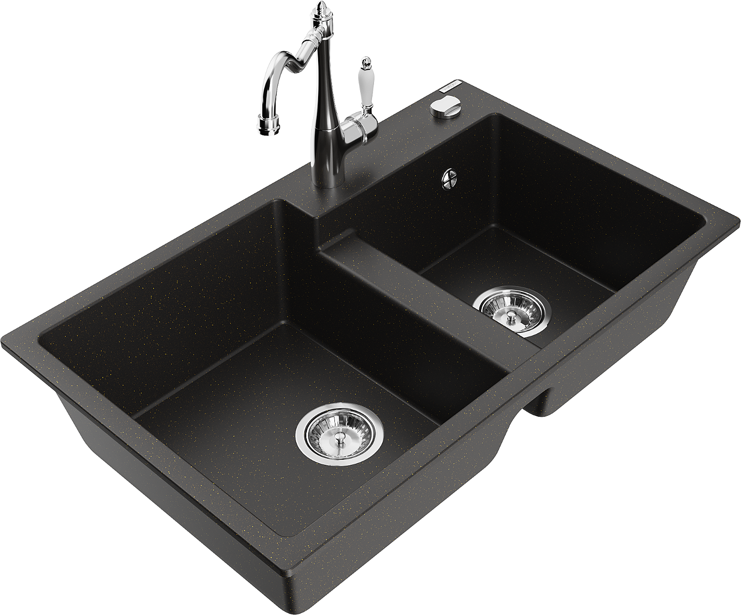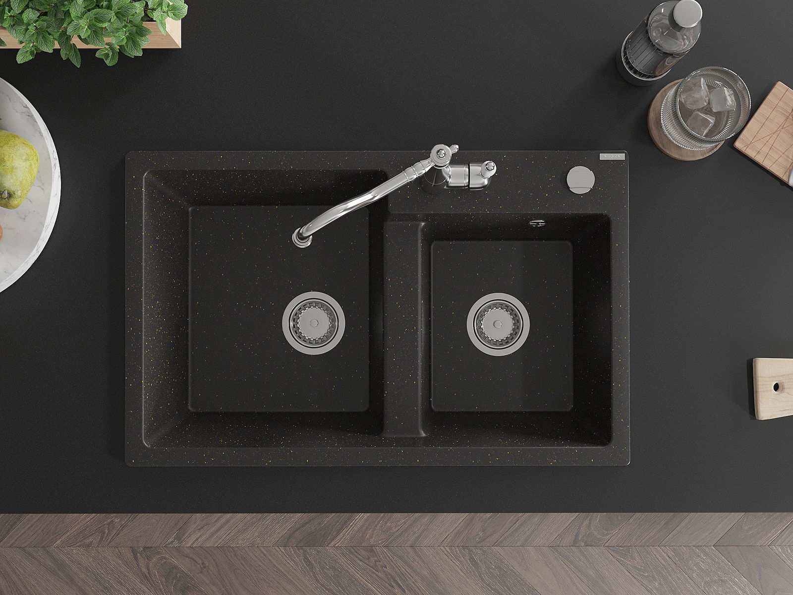 Mexen Tomas granitētā izlietne ar 2 nodalījumiem un virtuves jaucējkrānu Carla, melns/zeltīts metāliskais - 6516-75-670700-00