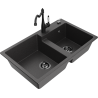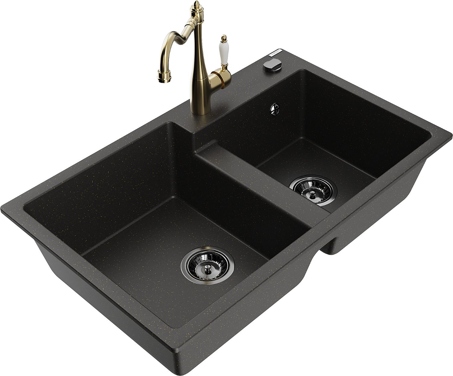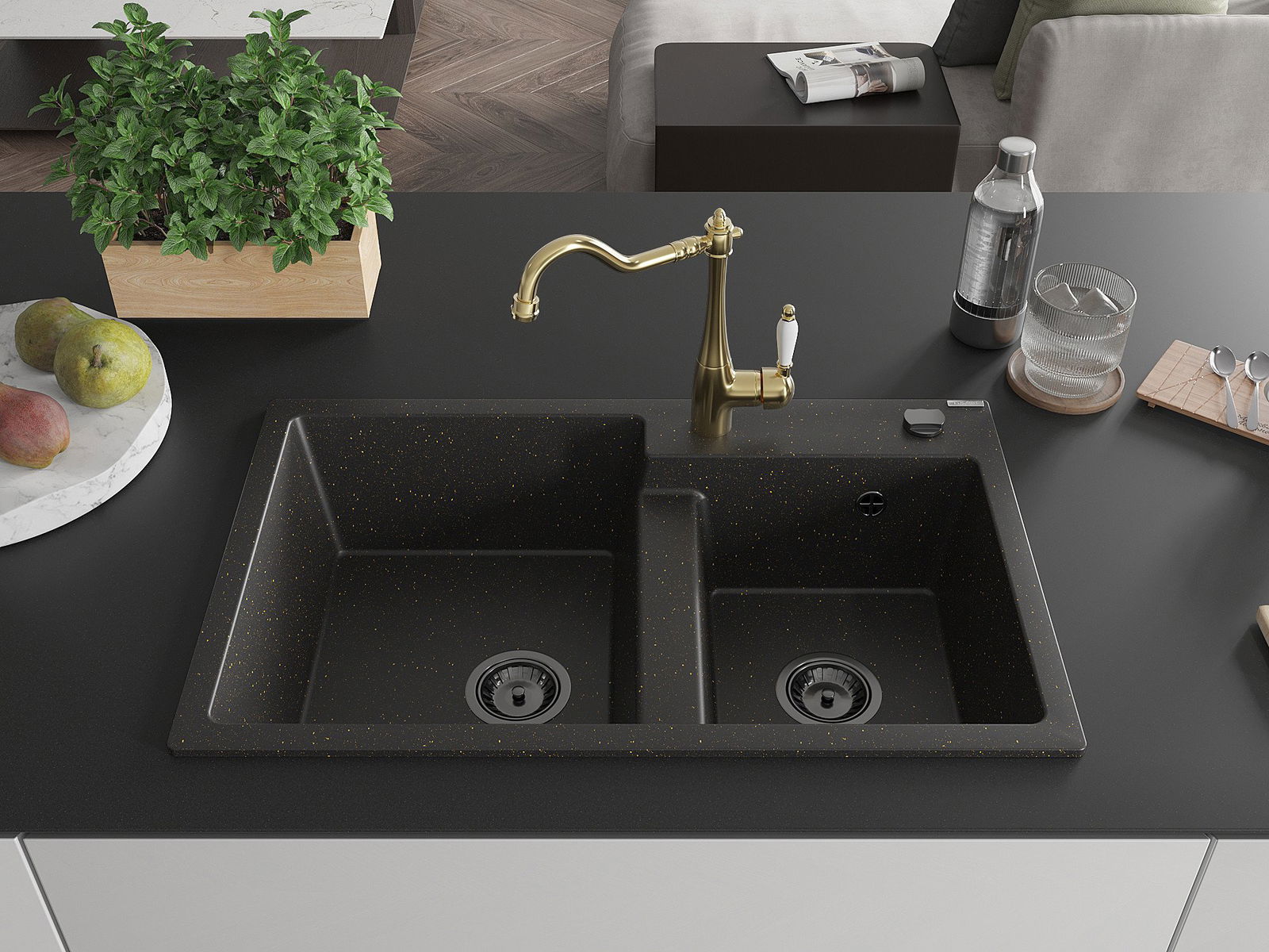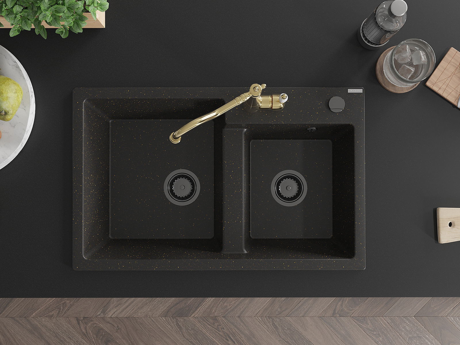 Mexen Tomas granitā izlietne ar divām sekcijām un Carla virtuve jaucējkrānu, melna/zeltīta metāliska - 6516-75-670700-50-B