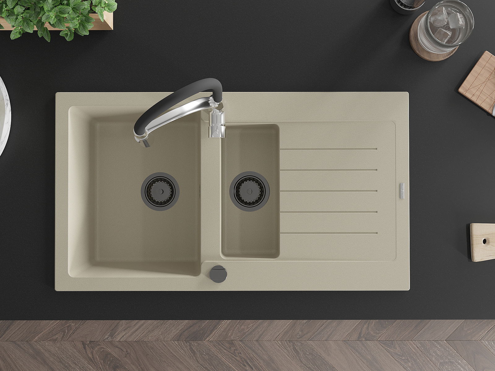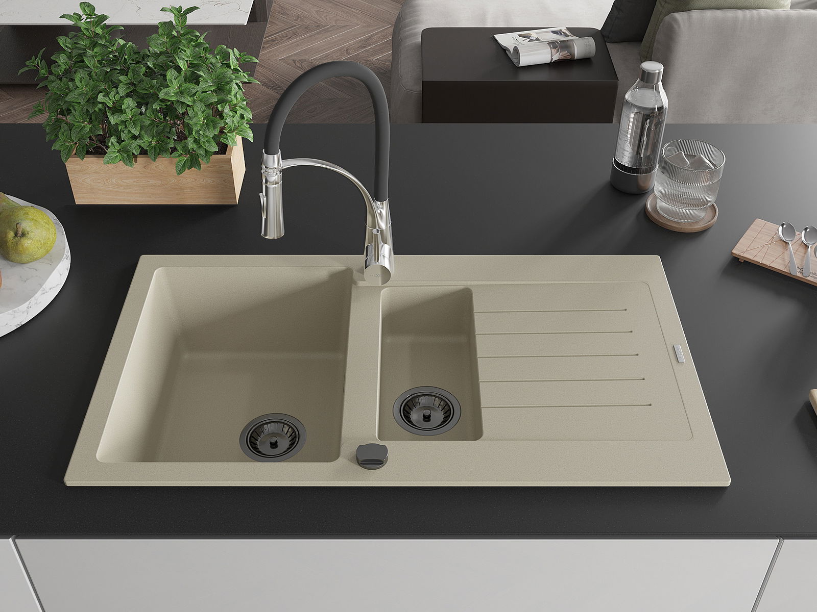 Mexen Matias 1,5 nodalījuma granīta izlietne ar noteces zonu un virtuves jaucējkrānu Aster, bēšs - 6502-69-73450-07-B