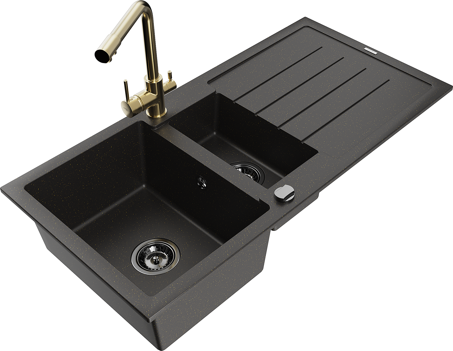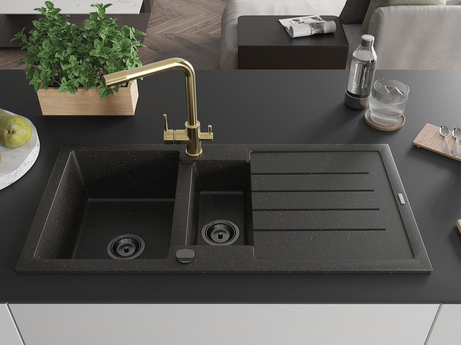 Mexen Andres granitā izlietne ar 1,5 nodalījumiem un noteku un virtuves jaucējkrānu Duero, melns/zeltains - 6515-75-671600-50-B