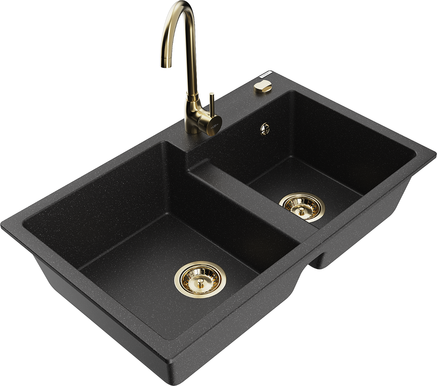 Mexen Tomas granitē izlietne ar 2 nodalījumiem un virtuves jaucējkrānu Telma, melns/sudraba metāliks - 6516-73-670200-50
