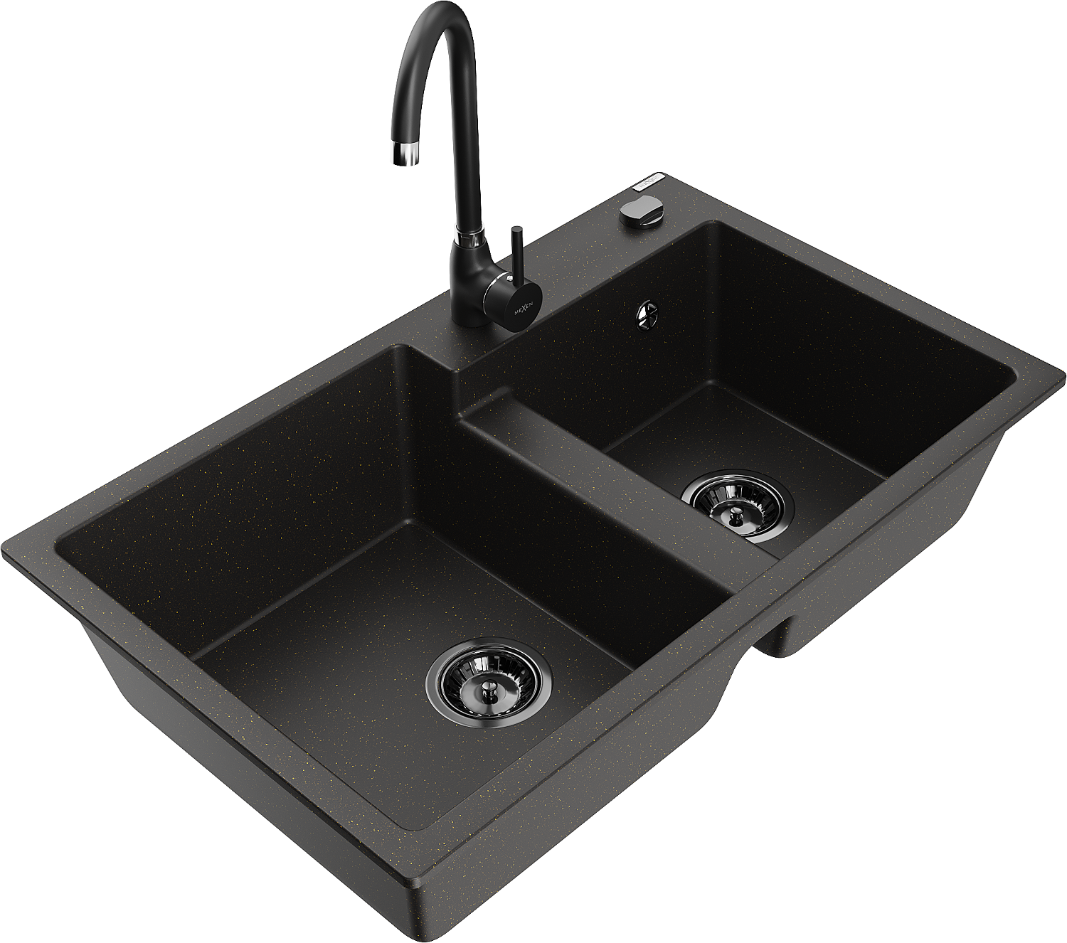Mexen Tomas granitizlietne 2 nodalījumi ar virtuves jaucējkrānu Telma, melns/zelta metāliks - 6516-75-670200-70-B