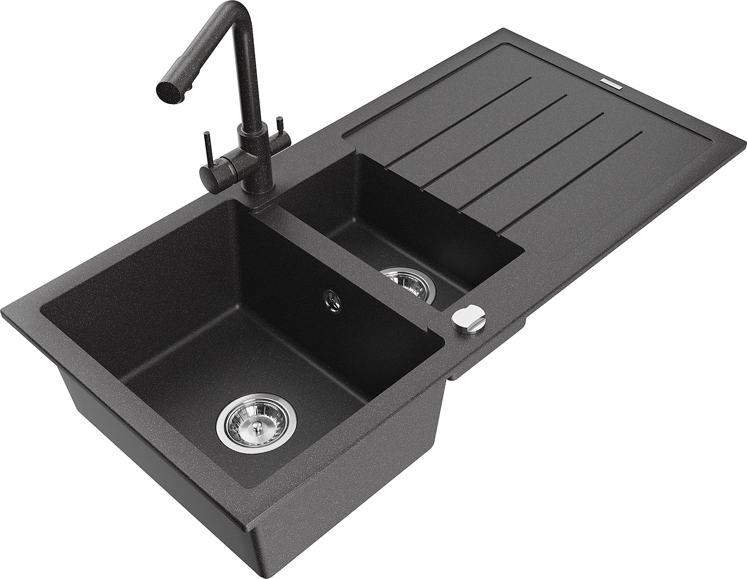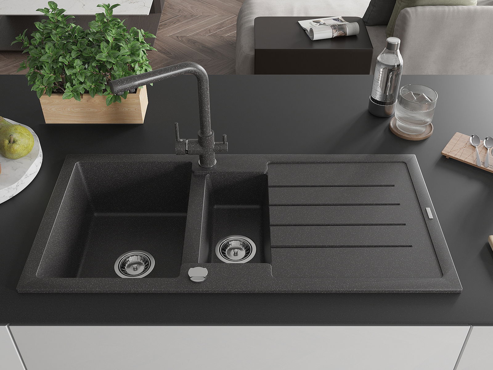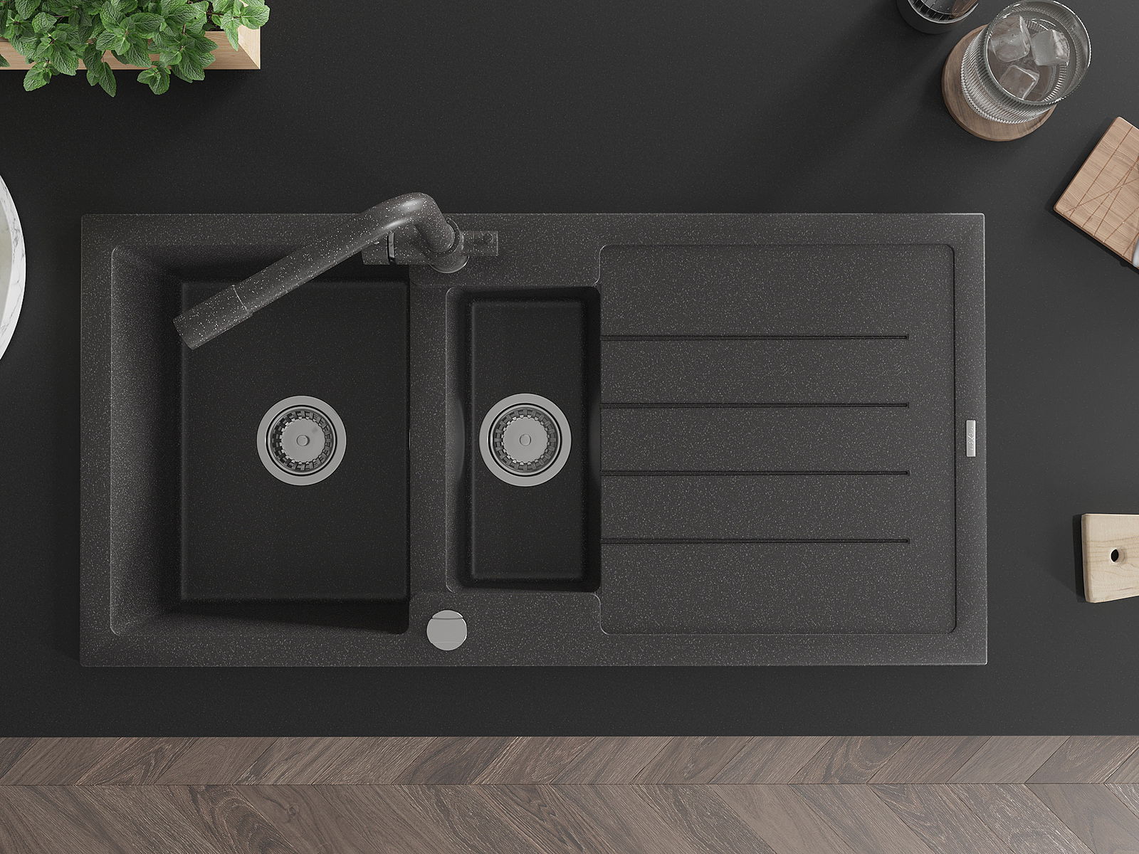 Mexen Andres granitizlietne 1,5 kamera ar noteci un virtuves jaucējkrānu Duero, melns raibais - 6515-76-671600-76