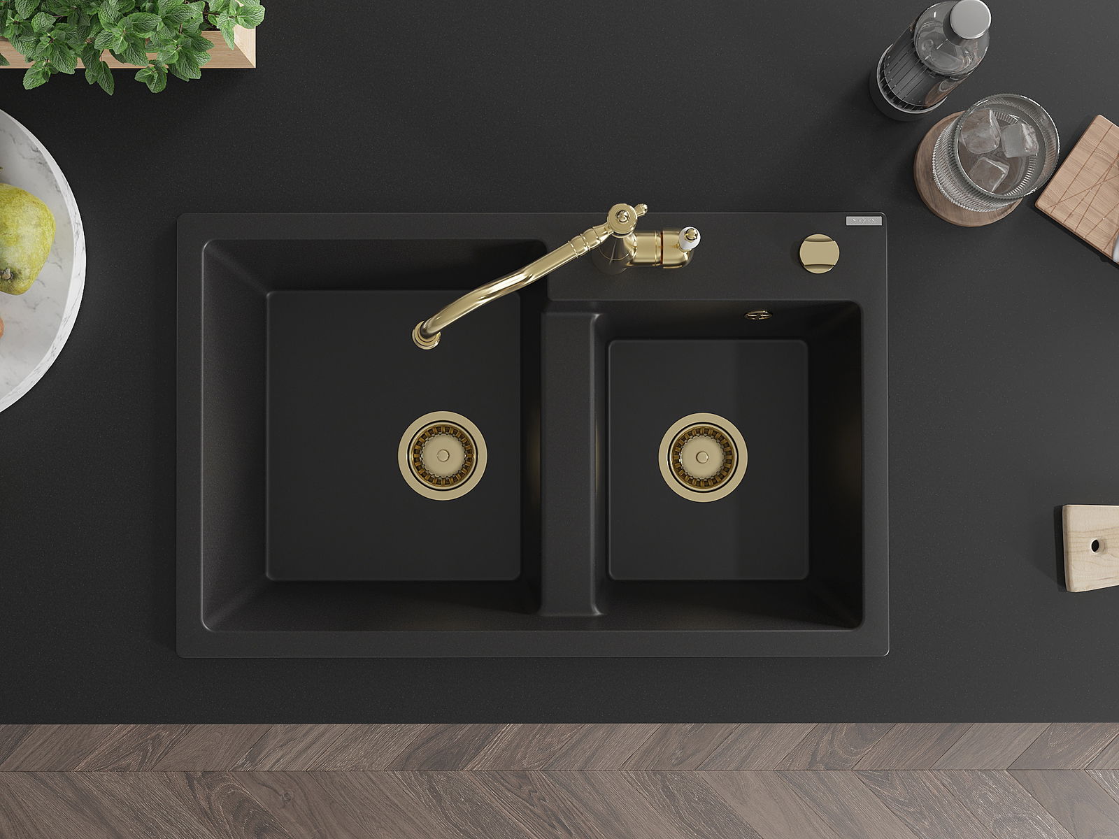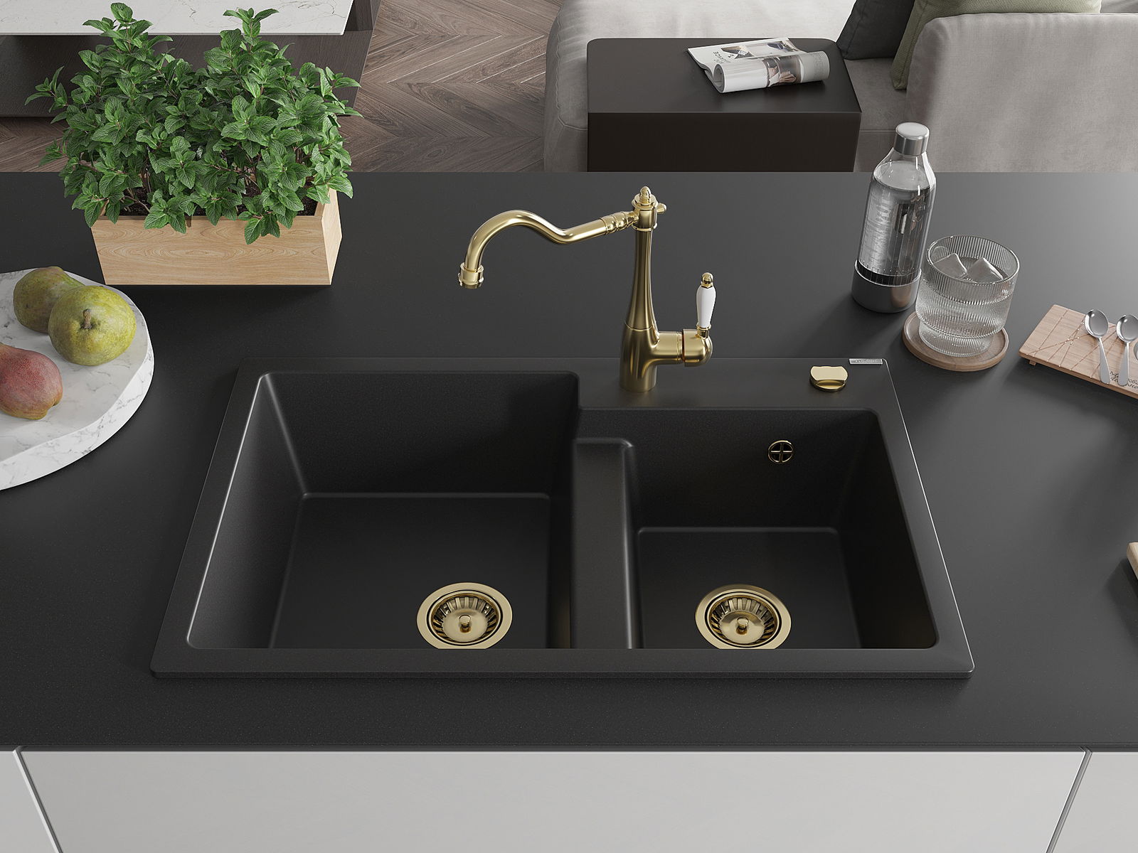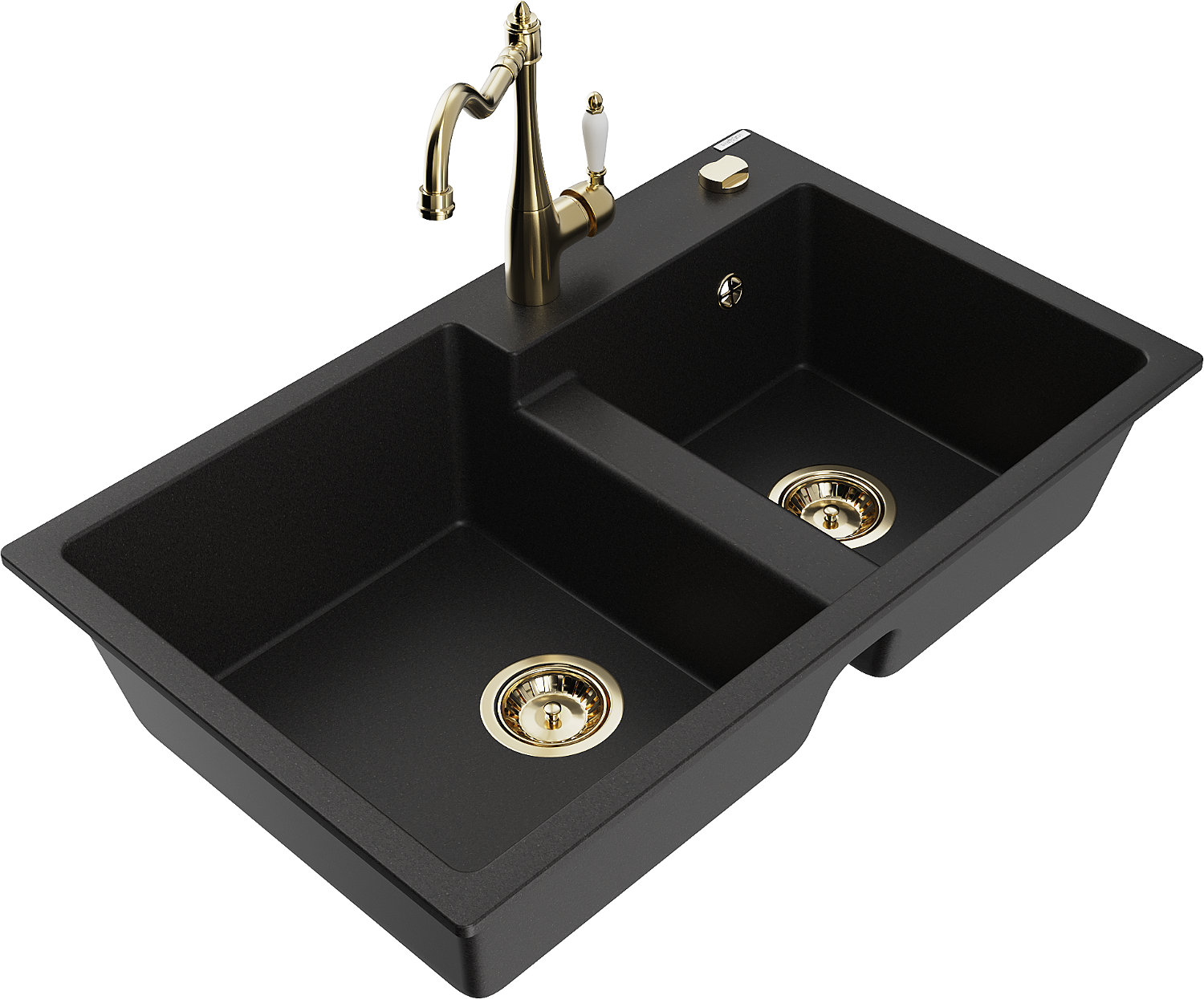 Mexen Tomas divu nodalījumu granīta izlietne ar Carlas virtuves jaucējkrānu, melna - 6516-77-670700-50
