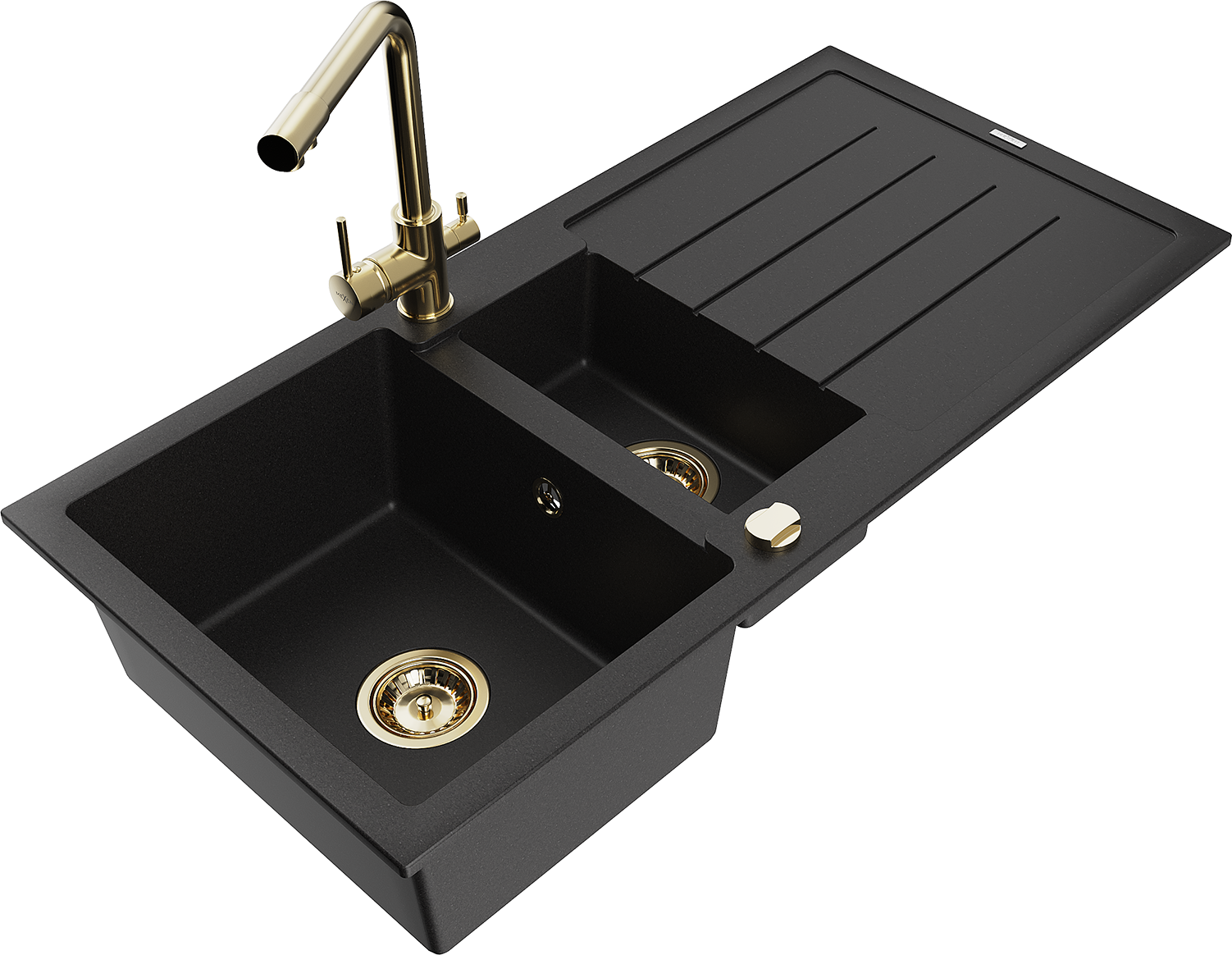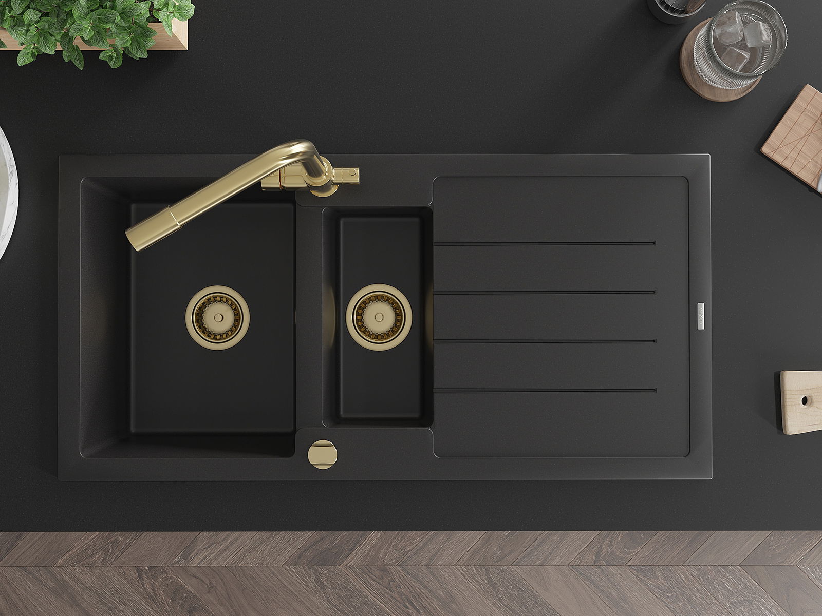 Mexen Andres granīta izlietne ar 1,5 nodalījumiem un noteci, virtuves jaucējkrāns Duero, melns - 6515-77-671600-50