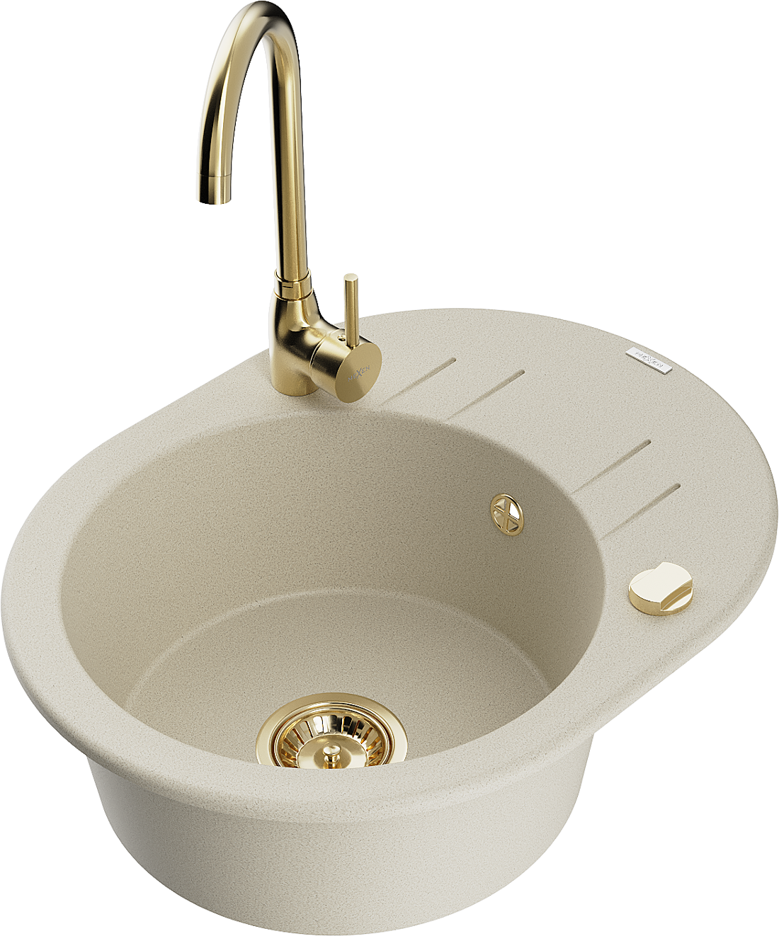 Mexen Kevin granīta izlietne 1-nodalījuma ar notecētāju un virtuves jaucējkrānu Telma, bēša - 6517-69-670200-50