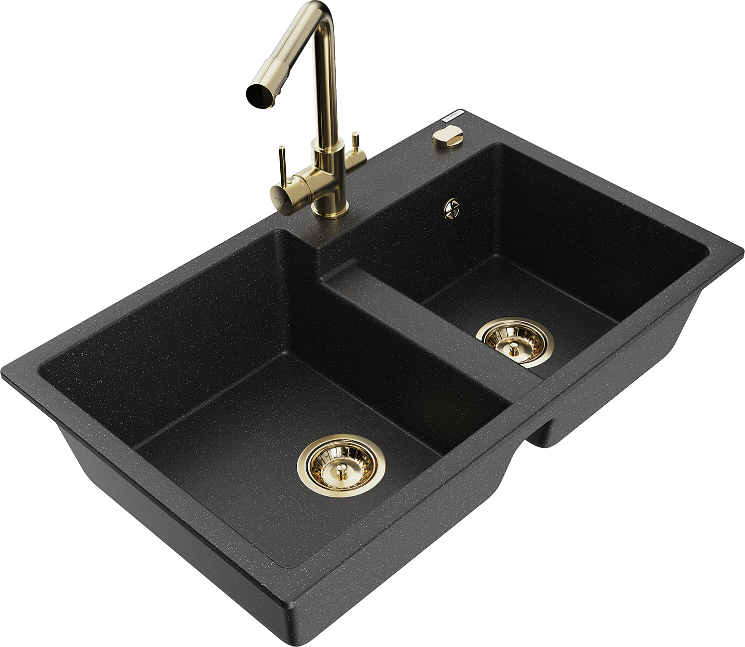 Mexen Tomas divpadsmit granīta 2-kameru izlietne ar virtuves jaucējkrānu Duero, melns/sudraba metālika - 6516-73-671600-50