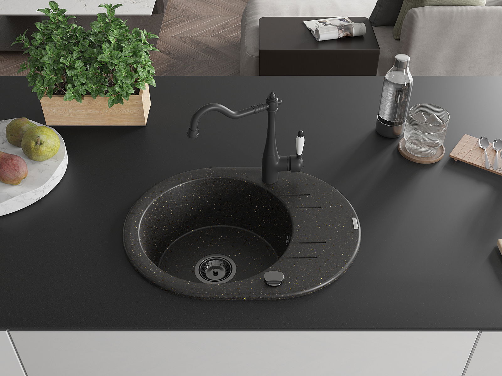 Mexen Kevin granitizlietne 1-kameras ar noteku un virtuves jaucējkrānu Carla, melns/zelta metāliks - 6517-75-670700-70-B