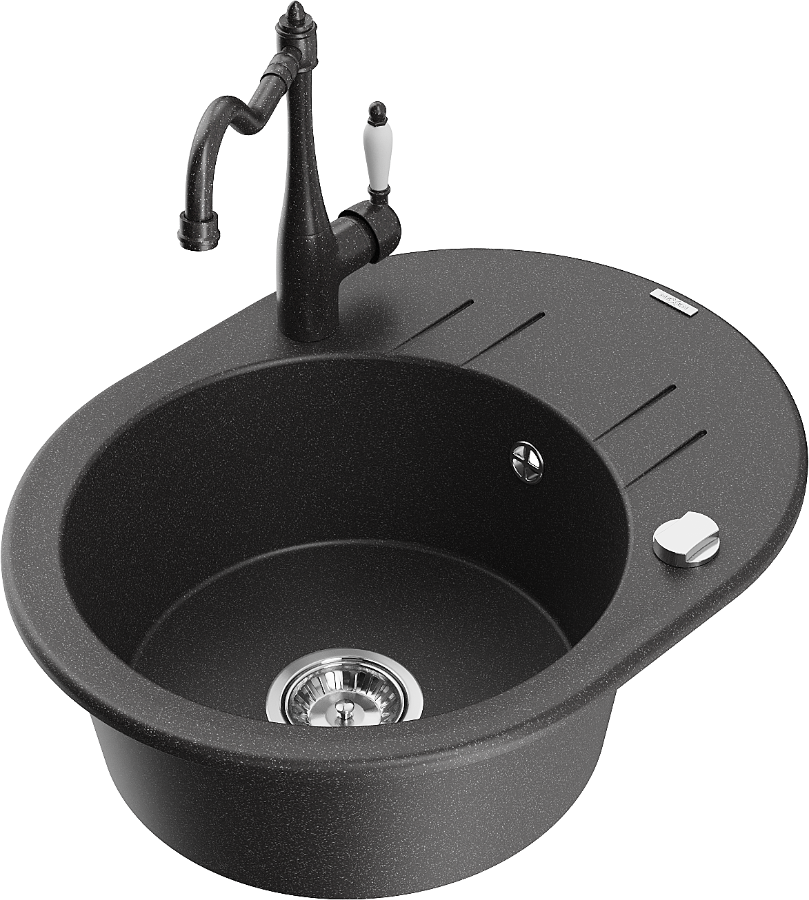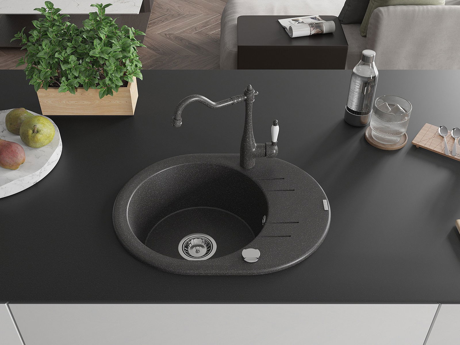 Mexen Kevin granitizlietne ar 1 nodalījumu ar noteci un virtuves jaucējkrānu Carla, melns ar plankumiem - 6517-76-670700-76