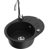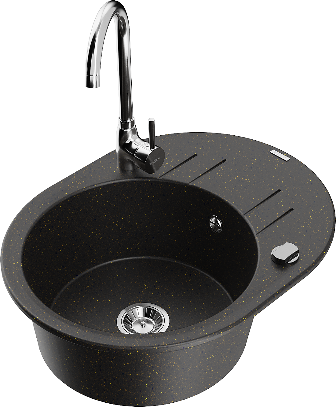 Mexen Kevin granitē izlietne ar vienu nodalījumu, noteces vietu un virtuves jaucējkrānu Telma, melns/zeltīts metālisks
