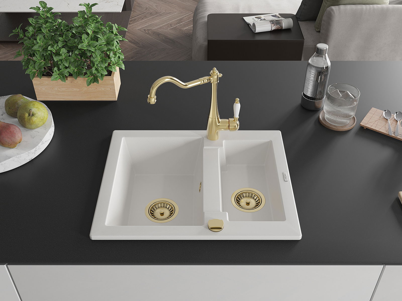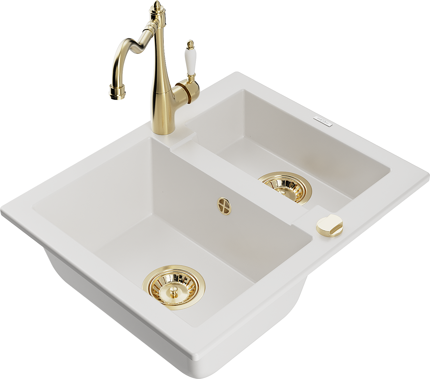 Mexen Carlos granitizlietne 1,5 nodalījumi ar virtuves jaucējkrānu Carla, balta - 6518-20-670700-50