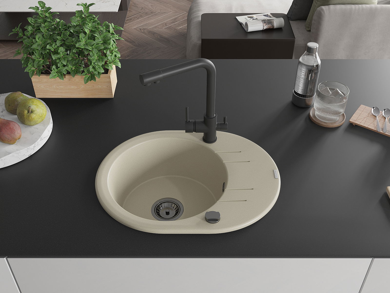 Mexen Kevin granīta izlietne ar 1 nodalījumu un noteci un virtuves jaucējkrānu Duero, bēša - 6517-69-671600-70