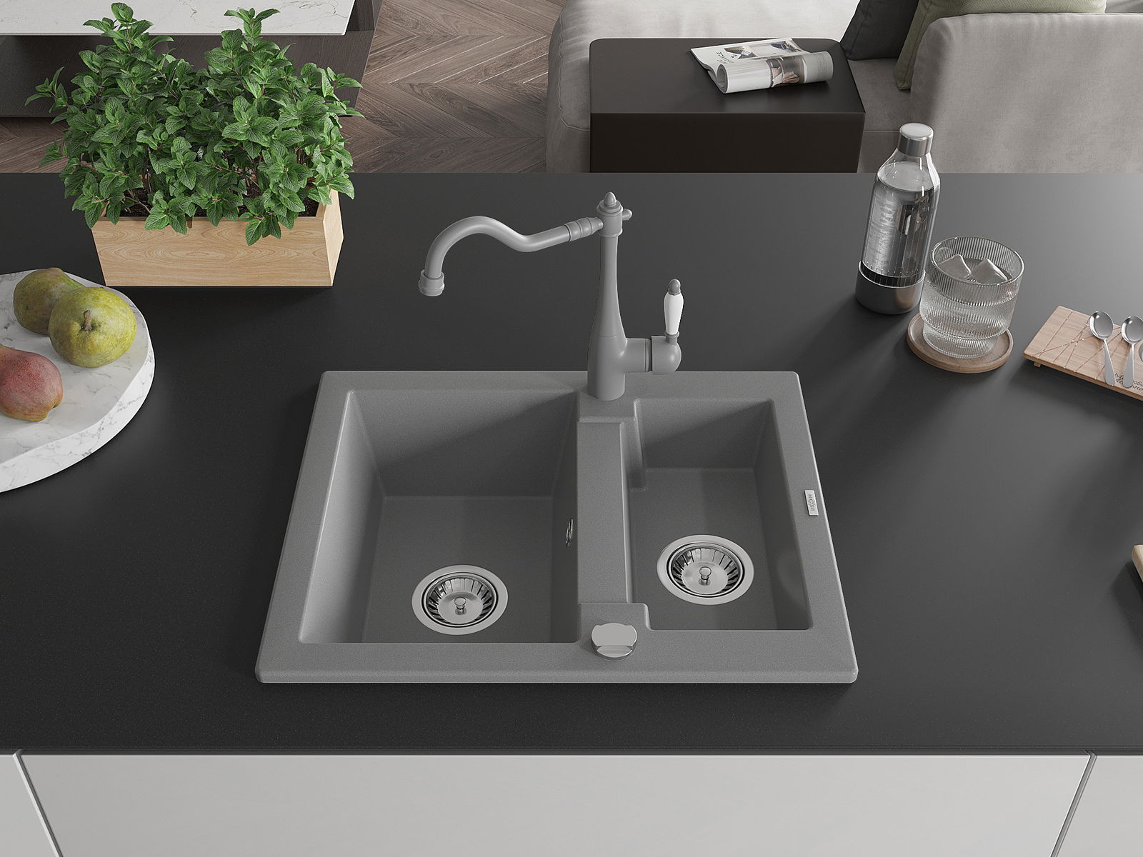 Mexen Carlos granīta izlietne ar 1,5 nodalījumu un virtuves jaucējkrānu Carla, pelēka - 6518-71-670700-71