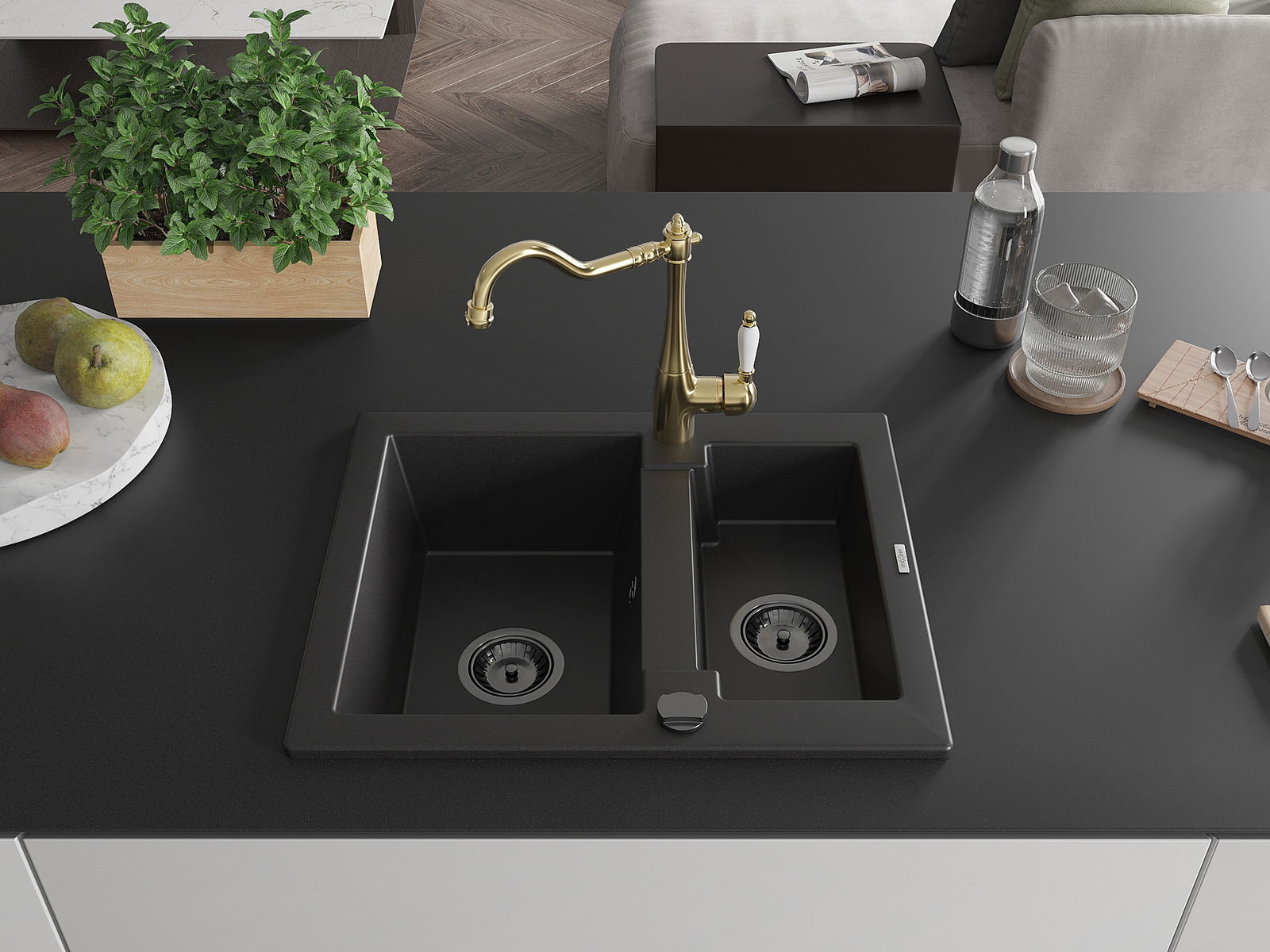 Mexen Carlos granitizlietne 1,5 nodalījumi ar virtuvītes jaucējkrānu Carla, melns - 6518-77-670700-50-B