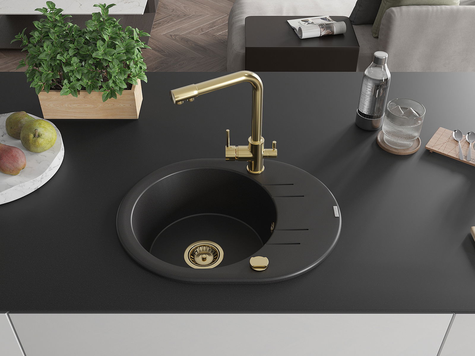Izlietnei ir 2 daļēji izurbtas atveres ar diametru 35 mm, kuras var pašrocīgi izsist. Tās var izmantot, piemēram, šķidruma dozatora uzstādīšanai, kas novērsīs plastmasas pudeļu klātbūtni virtuvē un piešķirs tai elegantu apdari.