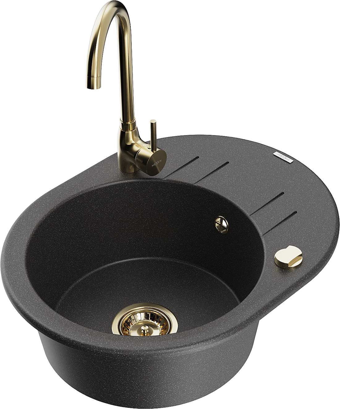 Mexen Kevin vienkameras granīta izlietne ar noteces virsmu un virtuves jaucējkrānu Telma, melns raibumains - 6517-76-670200-50
