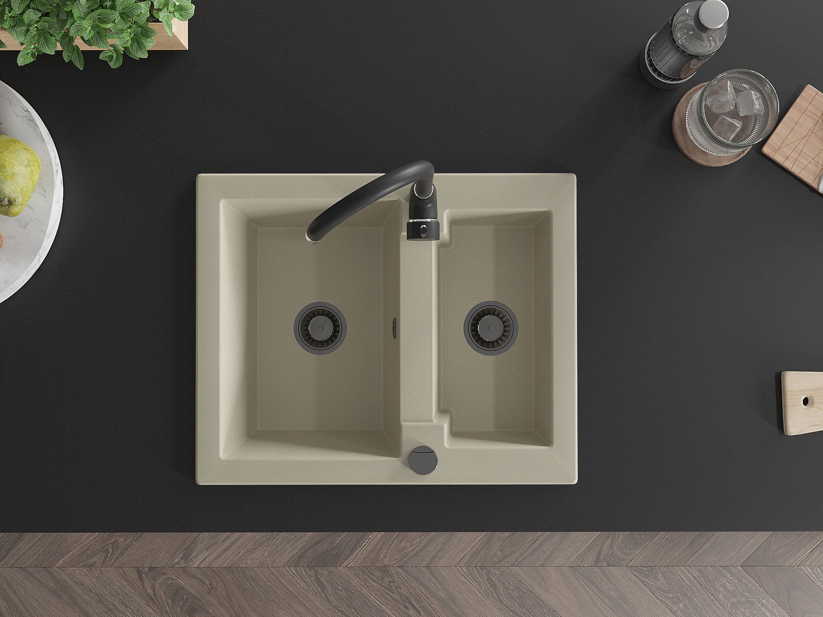 Mexen Carlos granit izlietne ar 1,5 nodalījumiem un virtuves jaucējkrānu Telma, bēšs - 6518-69-670200-70