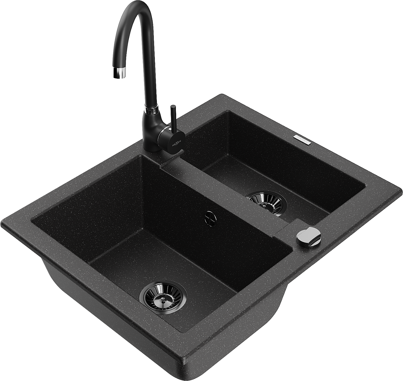 Mexen Carlos granīta izlietne ar 1,5 nodalījumiem un virtuves jaucējkrānu Telma, melna/sudraba metālika - 6518-73-670200-70-B