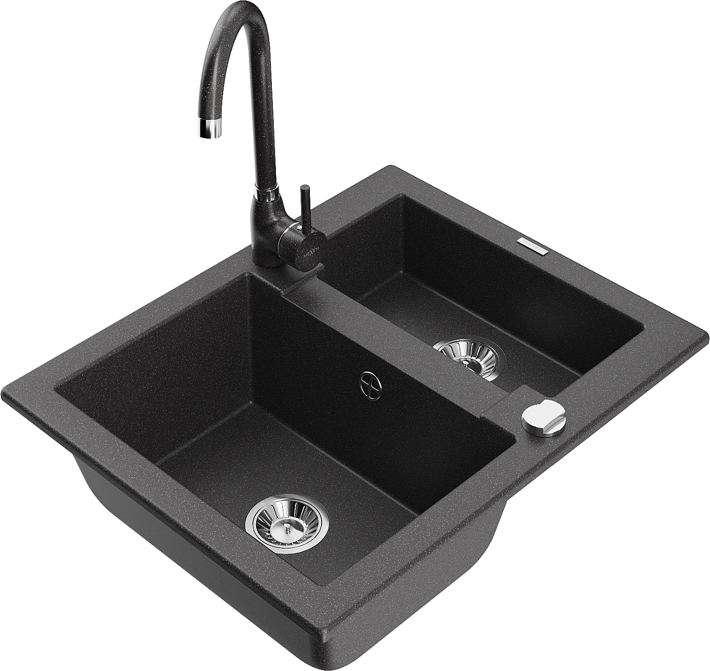 Mexen Carlos 1,5 nodalījumu granīta izlietne ar virtuves jaucējkrānu Telma, melna ar plankumiem - 6518-76-670200-76