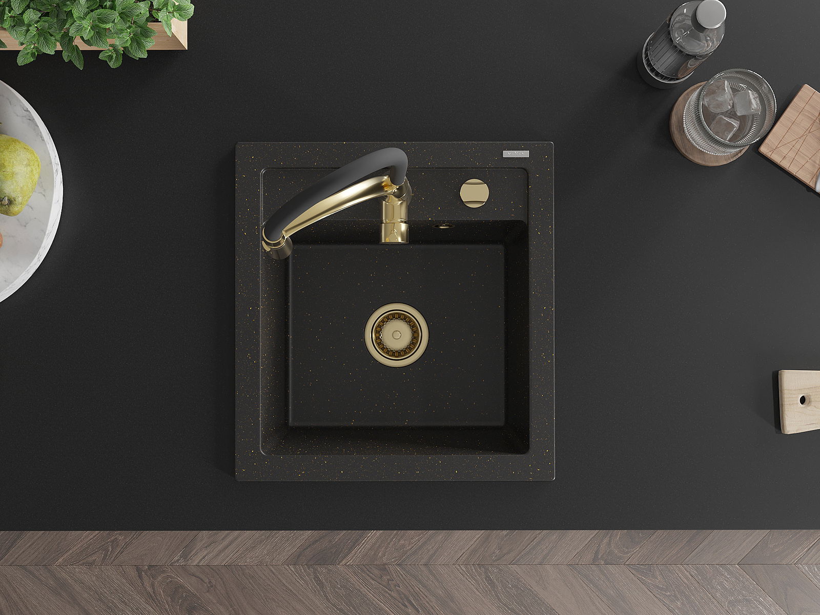Mexen Vito granitizlietne ar 1 nodalījumu un virtuves jaucējkrāns Aster, melns/zeltains metālisks - 6503-75-73450-57-G
