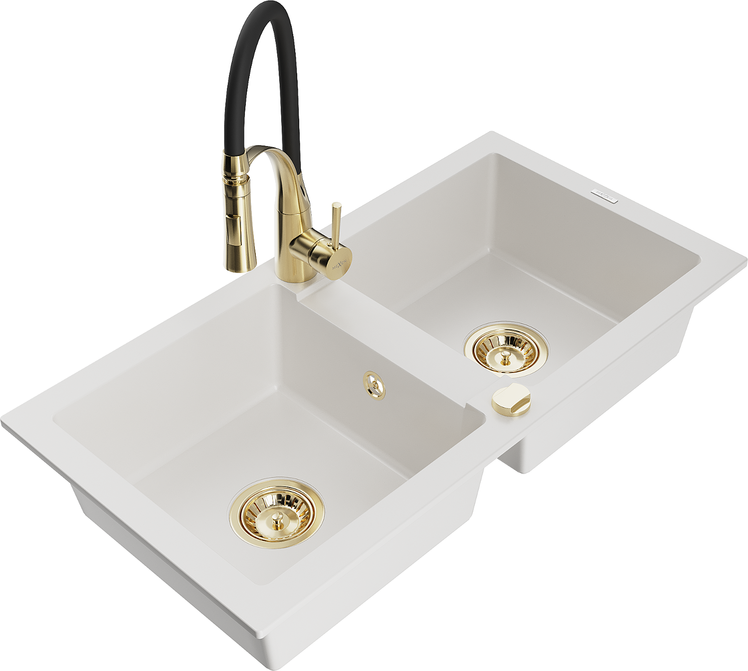 Mexen Mario granitīgs izlietne ar divām nodalījumiem un virtves krānu Aster, balts - 6504-20-73450-57-G