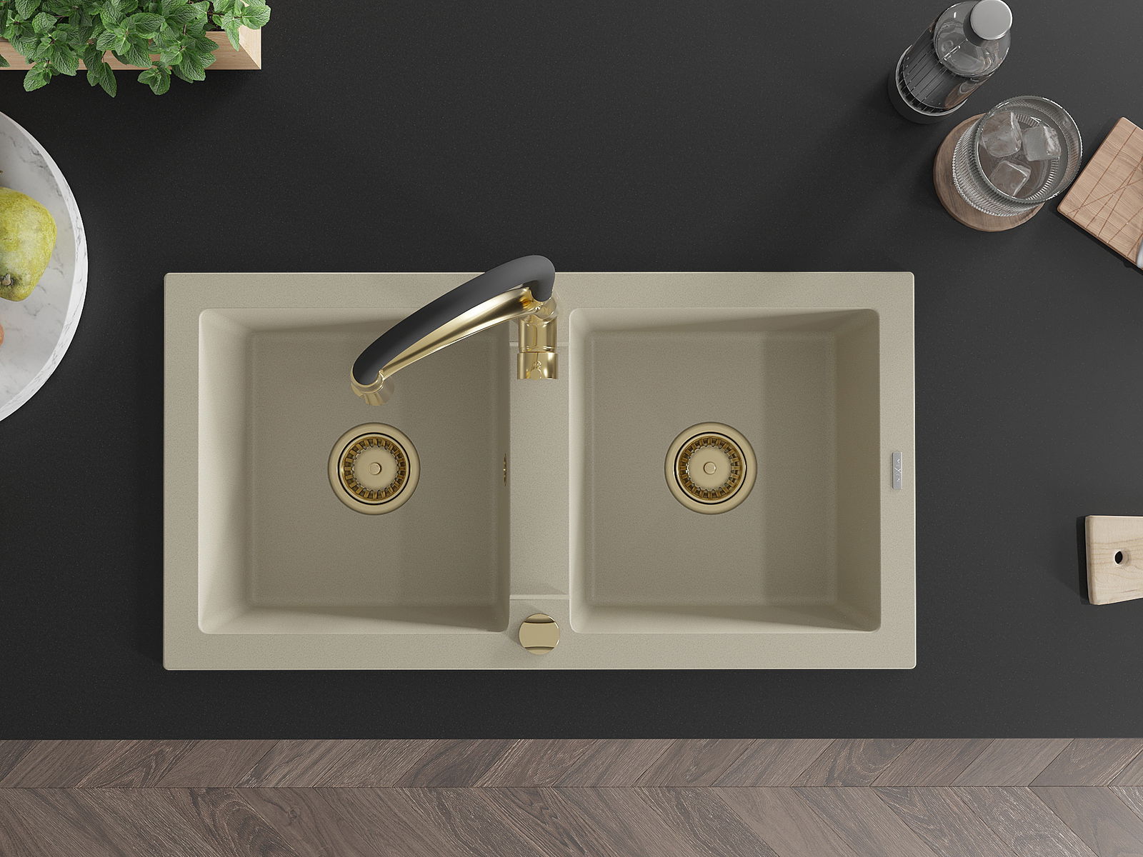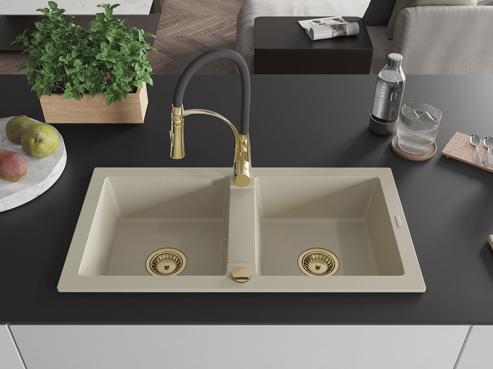 Mexen Mario granitā izlietne ar 2 nodalījumiem un virtuves jaucējkrānu Aster, bēša - 6504-69-73450-57-G
