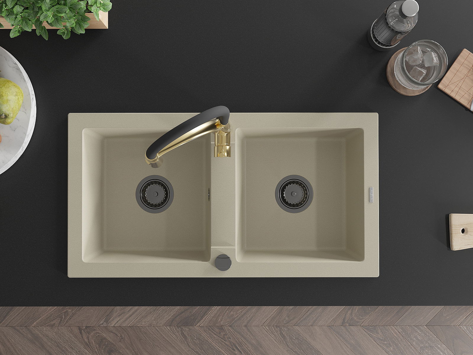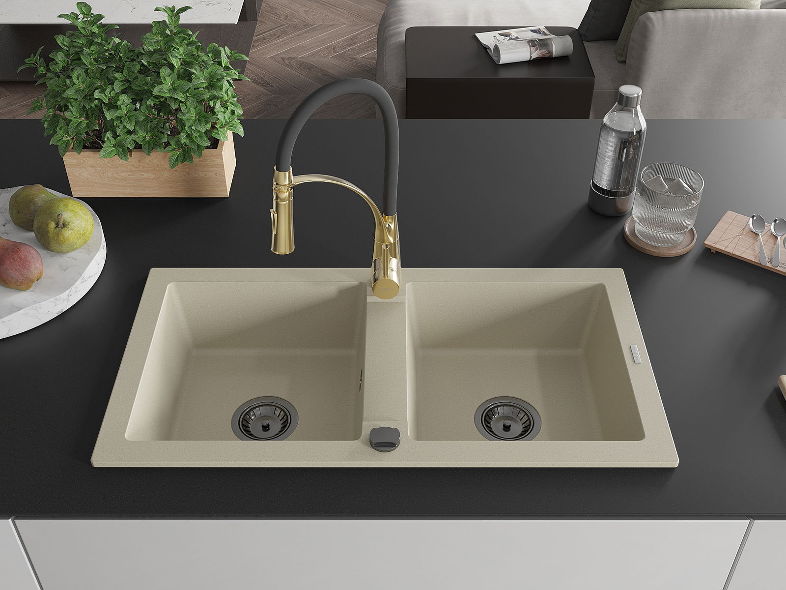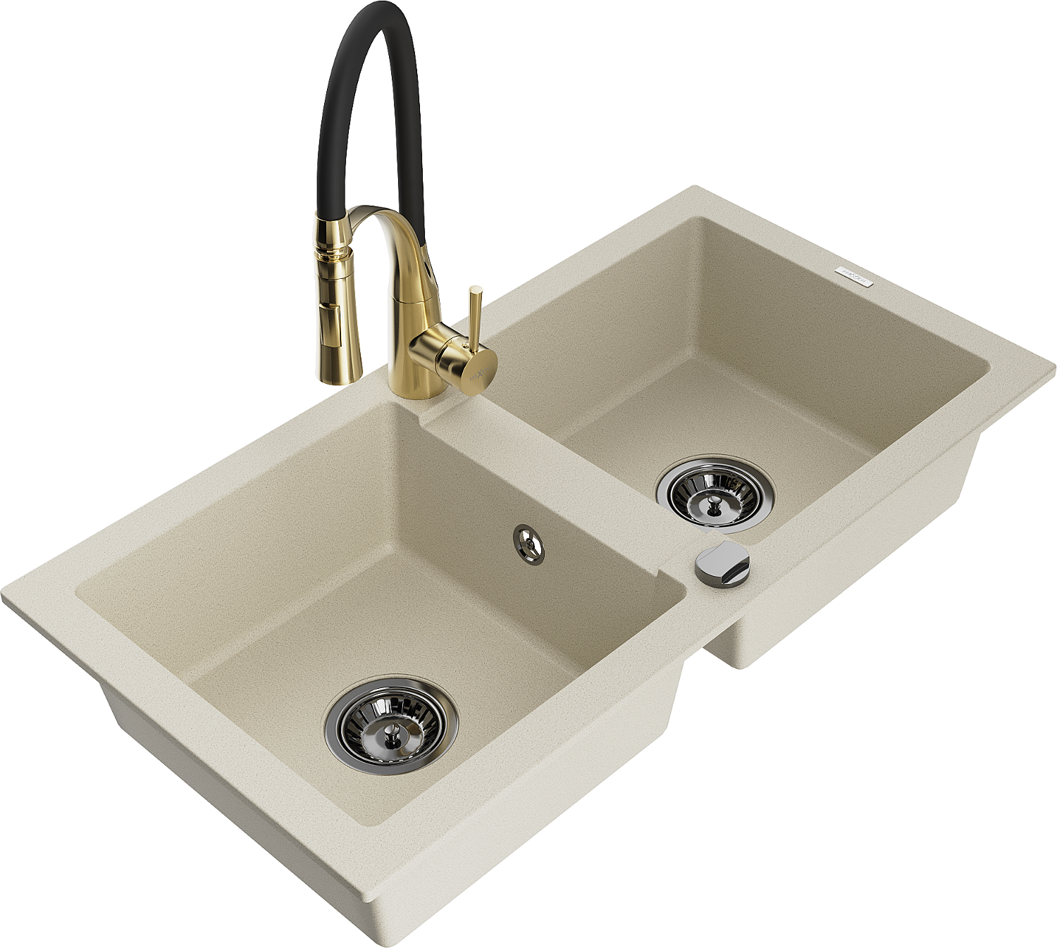 Mexen Mario divpadsmit skaitļu granīta izlietne ar divām kamerām un virtuves jaucējkrānu Aster, bēša - 6504-69-73450-57-B