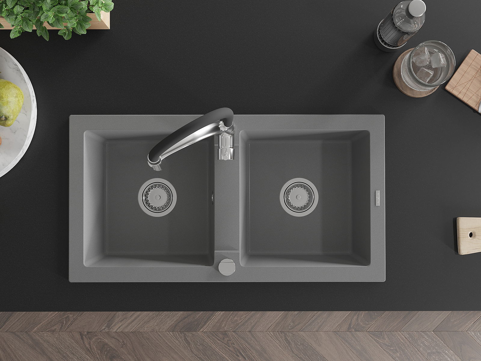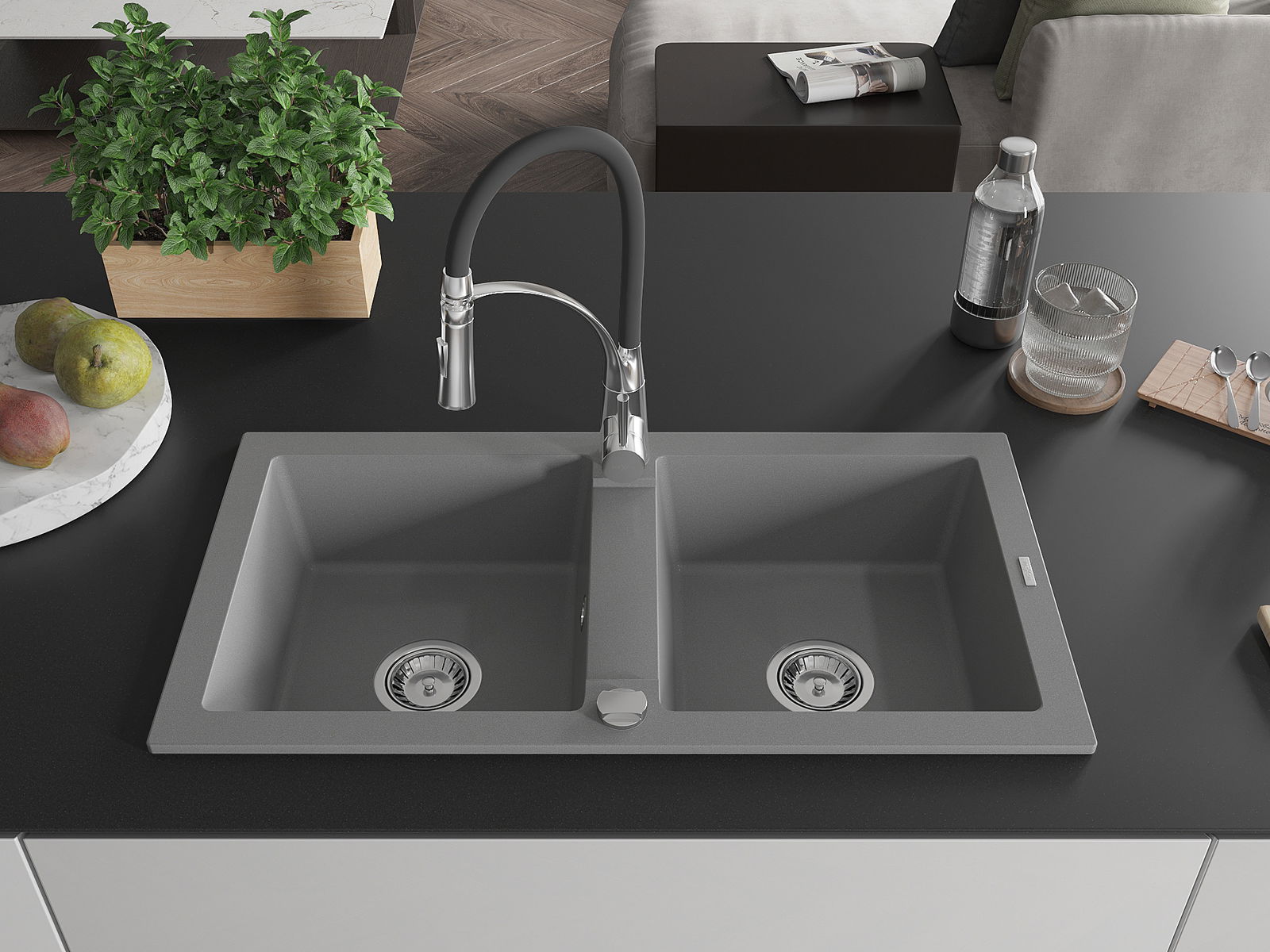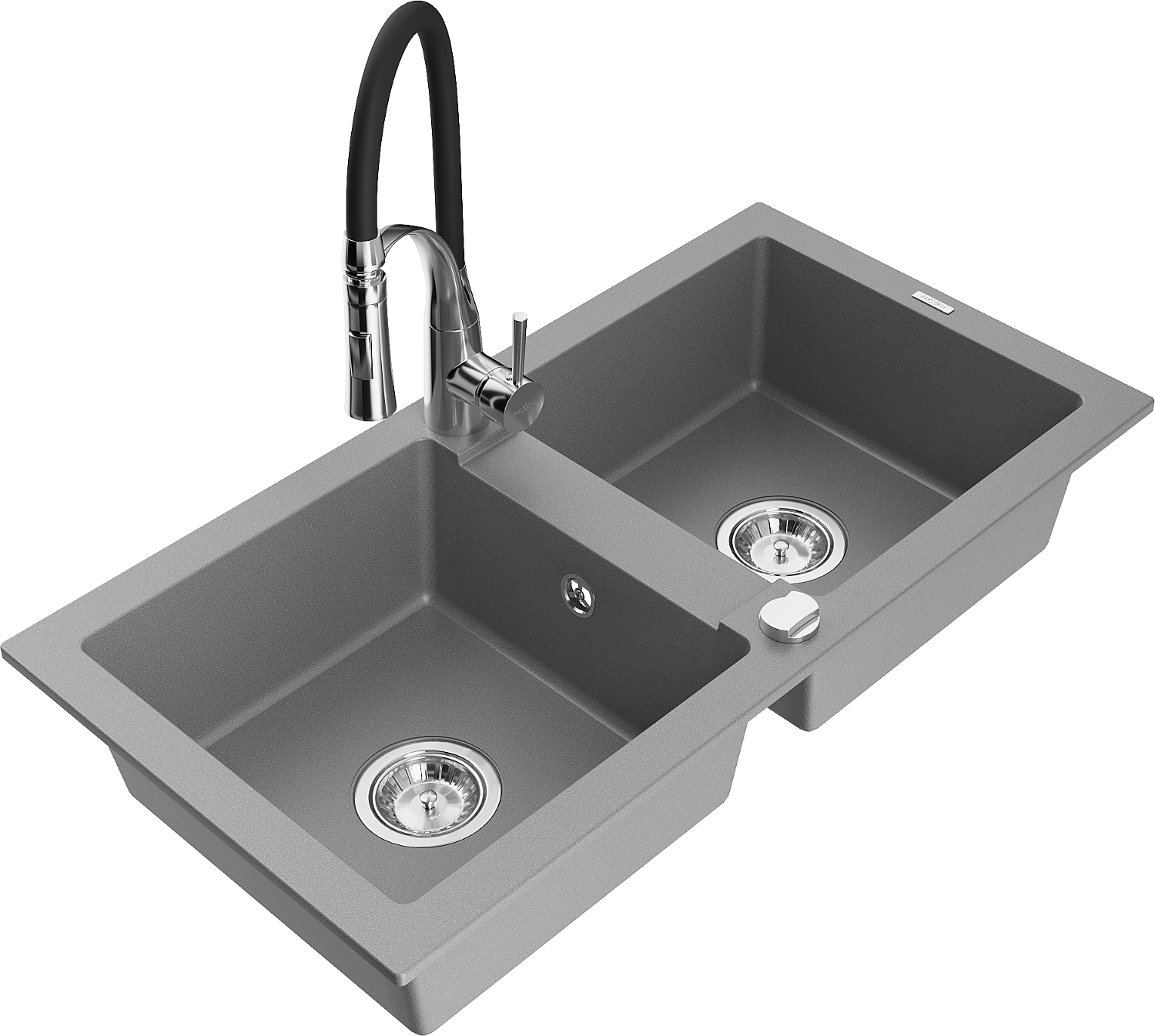 Mexen Mario divpadsmit granīta izlietne ar divām sekcijām un virtuves jaucējkrānu Aster, pelēks - 6504-71-73450-07