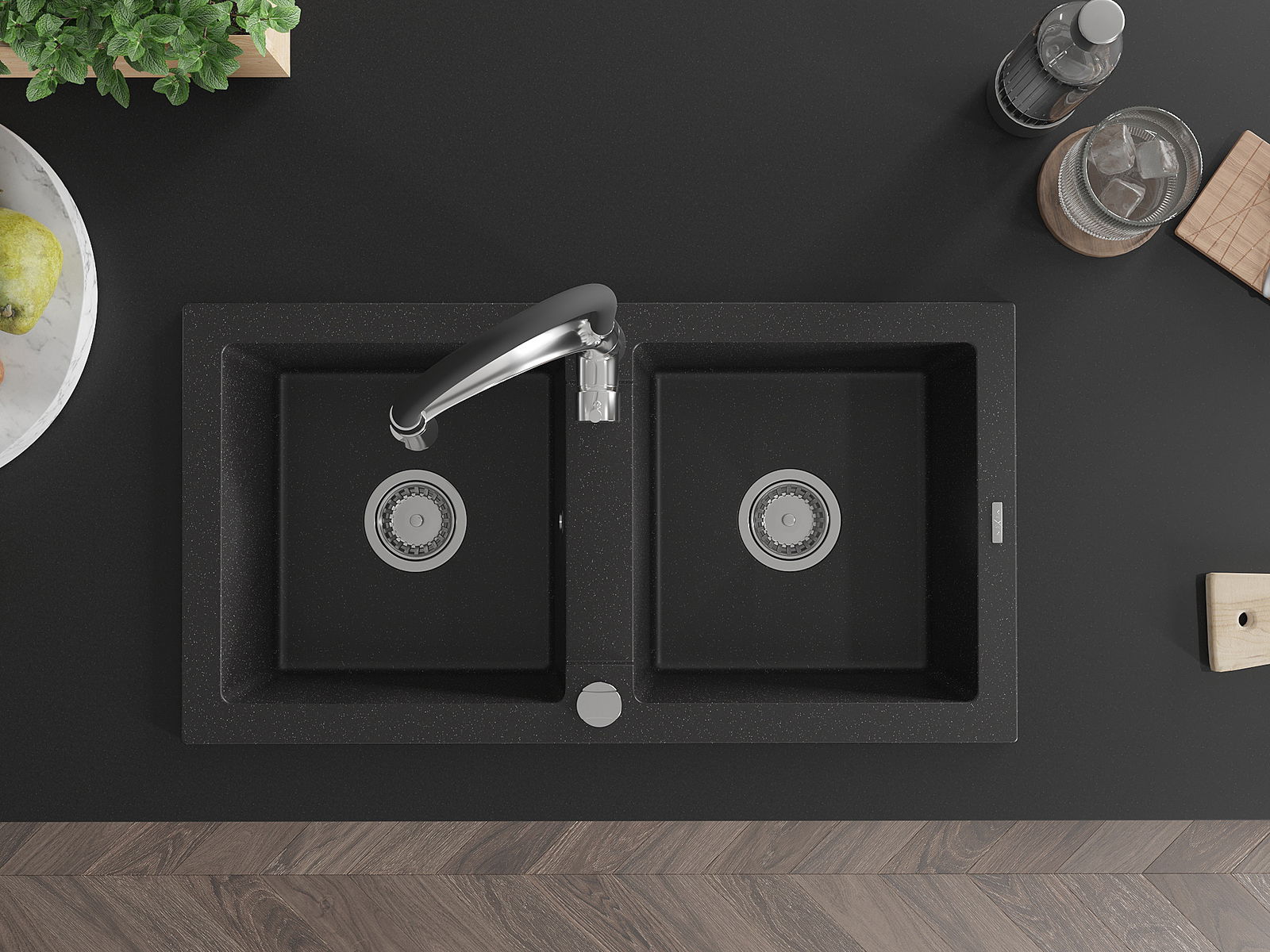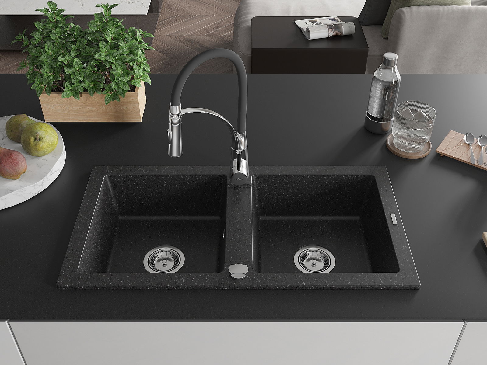 Mexen Mario granitizlietne ar divām kamerām ar virtuves jaucējkrānu Aster, melns/sudraba metāliks - 6504-73-73450-07