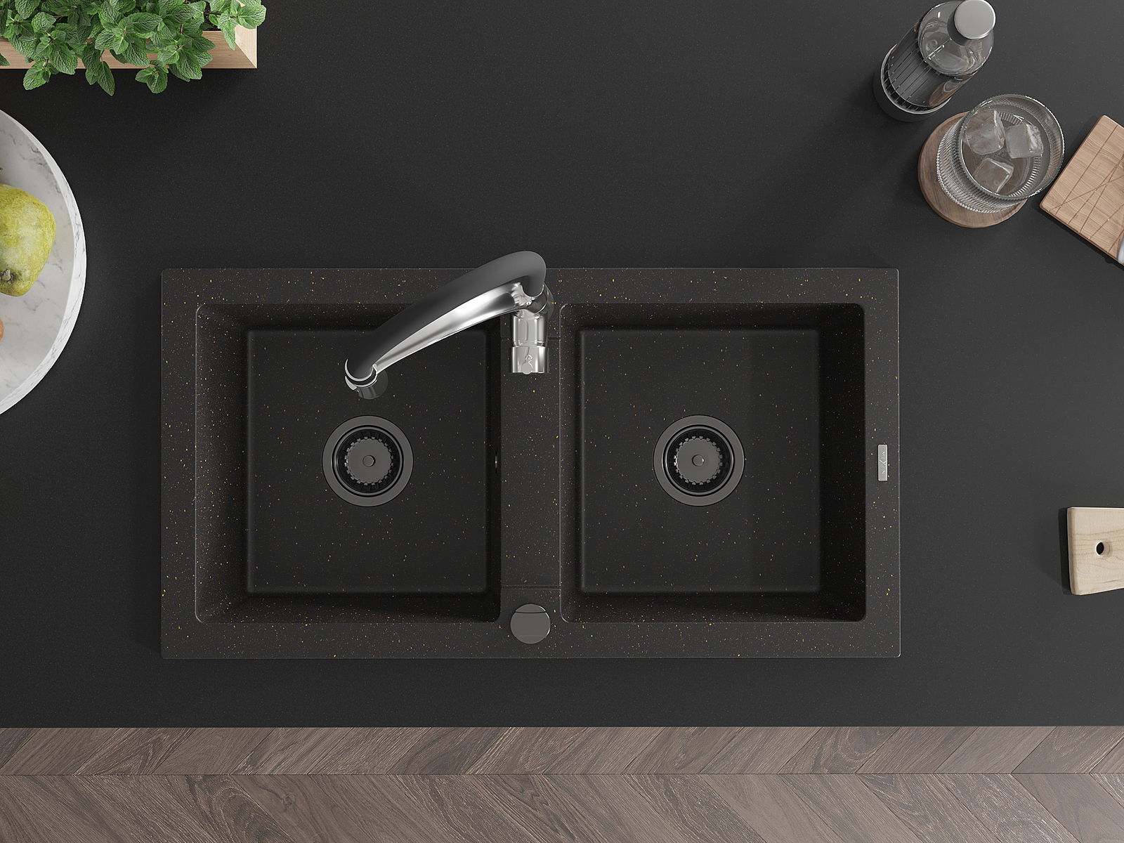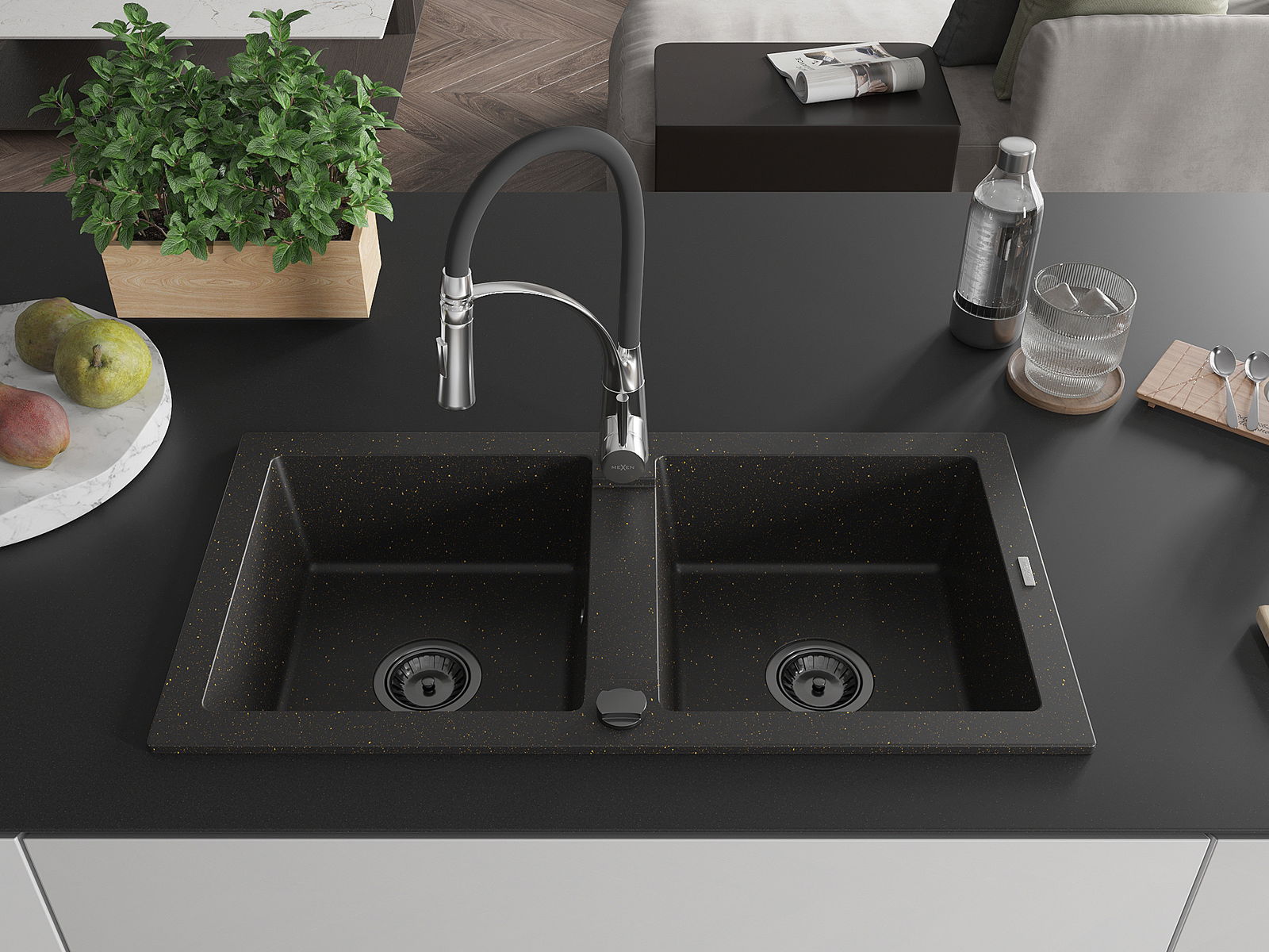 Mexen Mario granitlējuma izlietne ar 2 nodalījumiem un virtuves jaucējkrānu Aster, melns/zeltains - 6504-75-73450-07-B