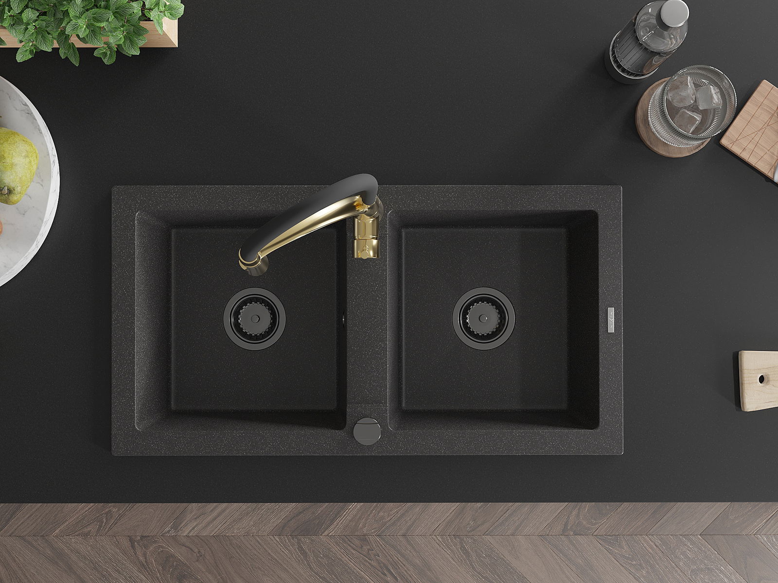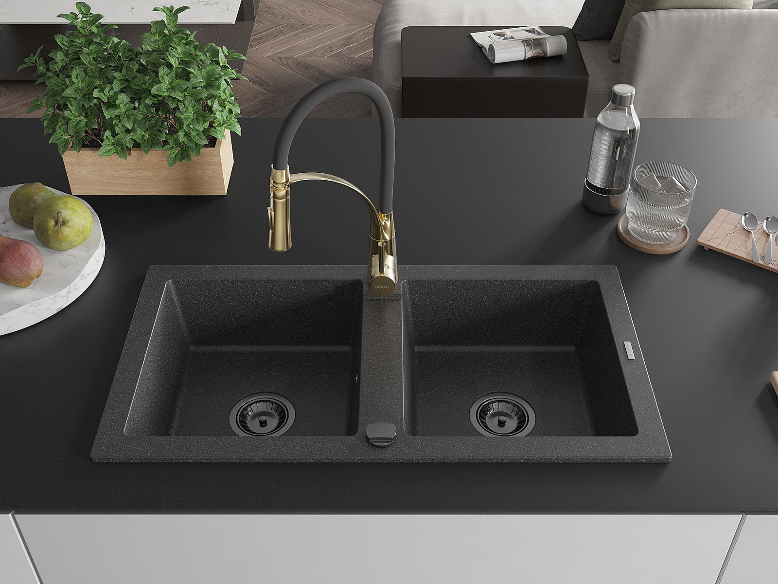 Mexen Mario granitizlietne ar divām kamerām un virtuvē bateriju Aster, melns ar punktiem - 6504-76-73450-57-B